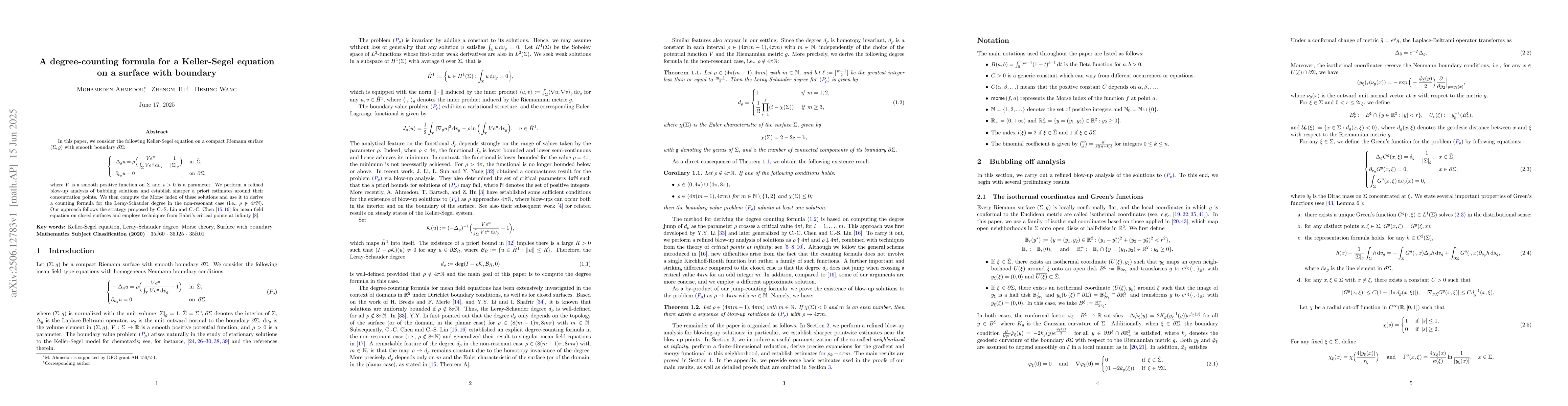 In this paper, we consider the following Keller-Segel equation on a compact Riemann surface $(\Sigma, g)$ with smooth boundary $\partial\Sigma$: \[ -\Delta_g u = \rho\Big(\frac{V e^u}{\int_{\Sigma} V e^u \mathrm{d} v_g} - \frac{1}{|\Sigma|_g}\Big) \text{ in } {\Sigma}, \quad \text{ with } \partial_{\nu_g} u = 0 \text{ on } \partial \Sigma, \] where $V$ is a smooth positive function on $\Sigma$ and $\rho > 0$ is a parameter. We perform a refined blow-up analysis of bubbling solutions and establish sharper a priori estimates around their concentration points. We then compute the Morse index of these solutions and use it to derive a counting formula for the Leray-Schauder degree in the non-resonant case (i.e., $\rho \notin 4 \pi \mathbb{N}$). Our approach follows the strategy proposed by C.-S. Lin and C.-C. Chen [15,16] for mean field equation on closed surfaces and employs techniques from Bahri's critical points at infinity [8].