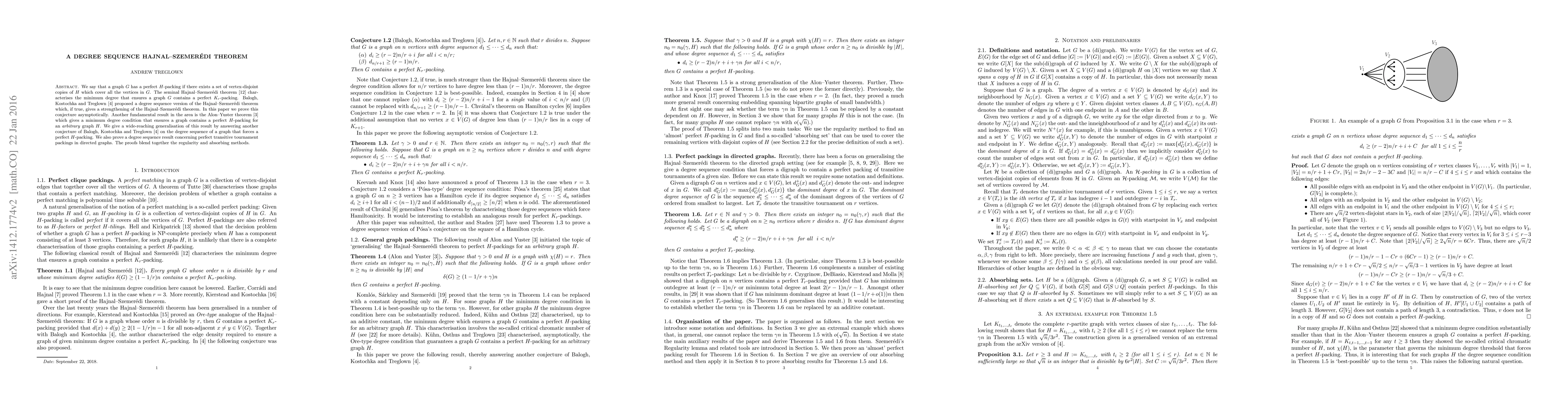 This paper proves a conjecture that strengthens the Hajnal-Szemerédi theorem by providing a degree sequence condition for perfect $H$-packings, and generalizes the Alon-Yuster theorem for arbitrary graphs. The proofs utilize the regularity and absorbing methods.