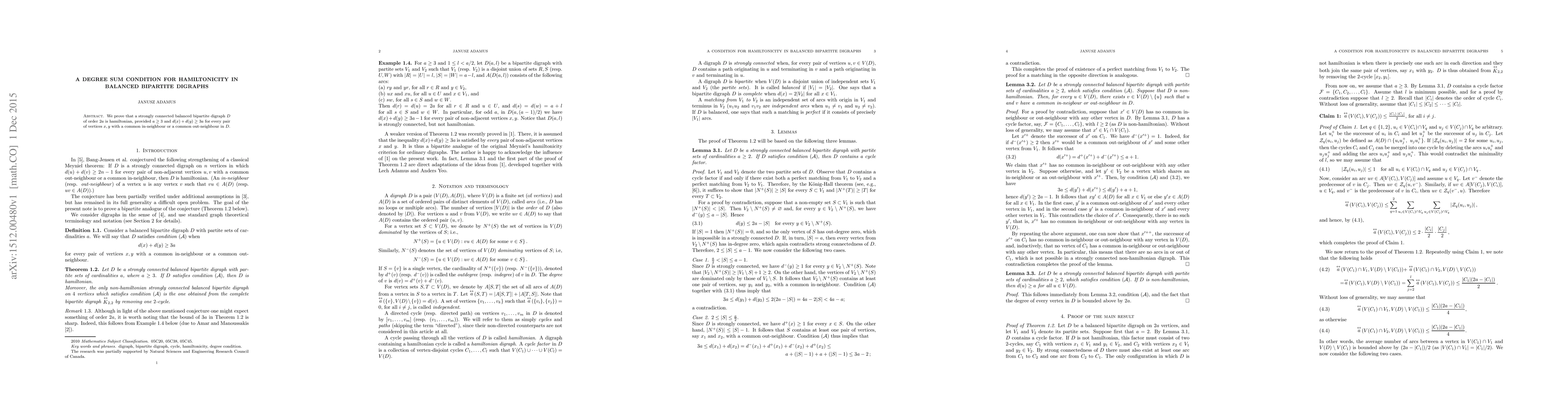 Summary: This paper establishes a degree sum condition for hamiltonicity in strongly connected balanced bipartite digraphs, proving that such digraphs of order $2a$ are hamiltonian if $a\geq3$ and the sum of degrees of any pair of vertices sharing a common in-neighbour or out-neighbour is at least $3a$.
