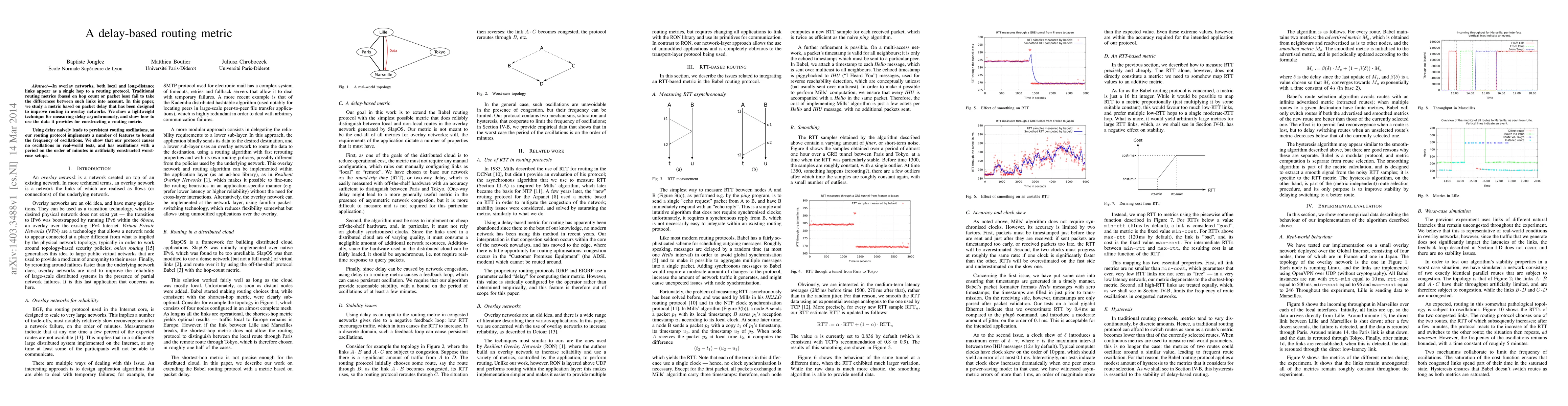 A new routing metric based on packet delay improves routing in overlay networks by addressing issues with traditional metrics like hop count and packet loss. The protocol bounds oscillations to prevent persistent routing problems.