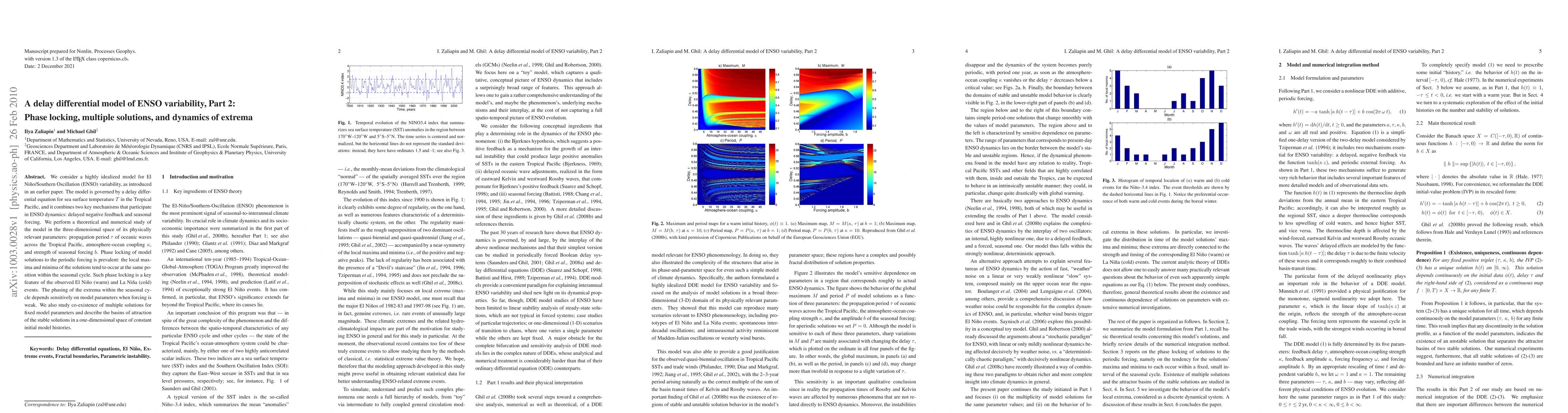 This research paper studies a delay differential model of El Nino/Southern Oscillation variability, finding that phase locking of solutions to seasonal forcing is prevalent and key to understanding ENSO dynamics, with phase locked extrema occurring at the same position within the seasonal cycle.