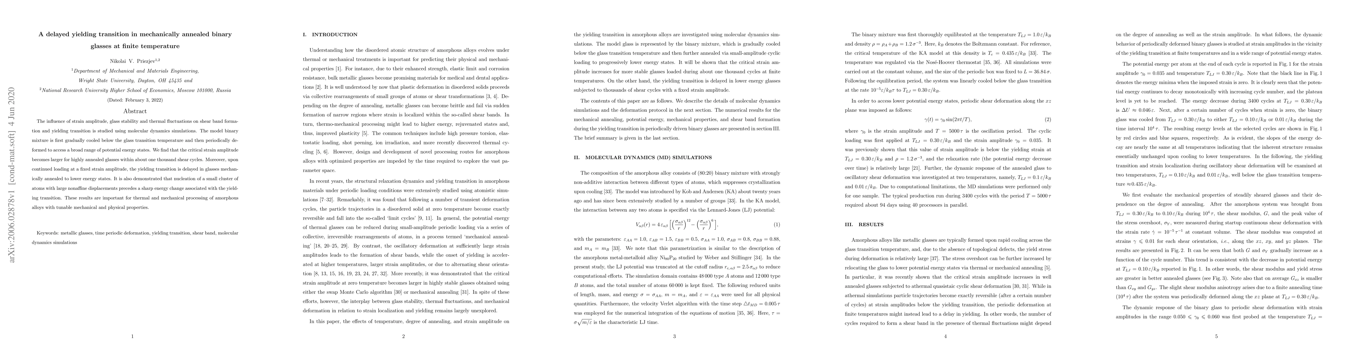 This study investigates how strain amplitude, glass stability, and thermal fluctuations affect shear band formation and yielding in binary glasses using molecular dynamics simulations. The research finds that mechanically annealed glasses require higher strain amplitudes to yield and that the yielding transition is delayed in glasses with lower energy states, highlighting the importance of these factors in processing amorphous alloys.