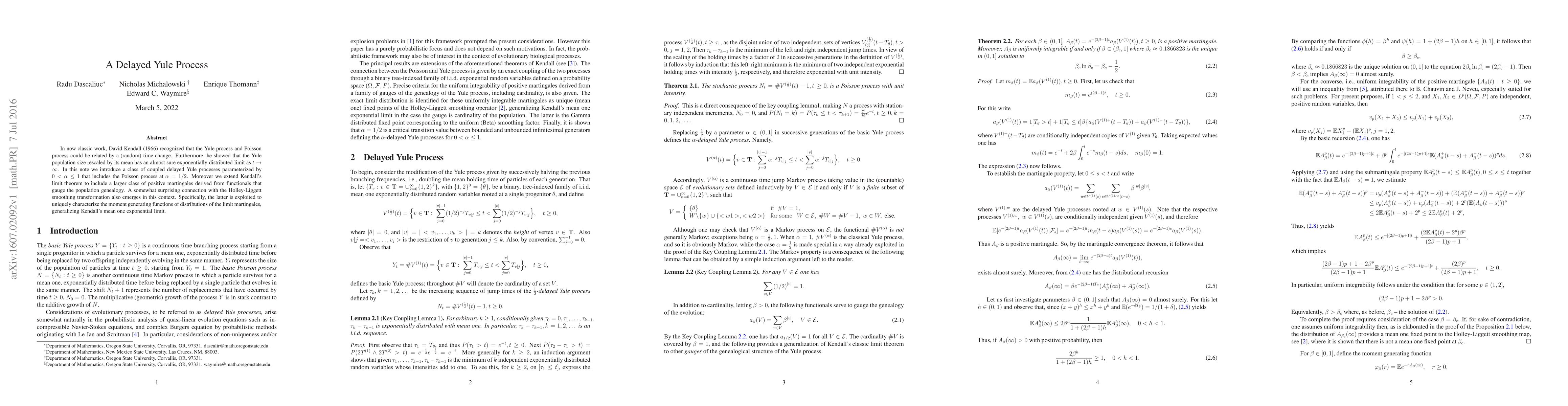 In now classic work, David Kendall (1966) recognized that the Yule process and Poisson process could be related by a (random) time change. Furthermore, he showed that the Yule population size rescaled by its mean has an almost sure exponentially distributed limit as $t\to \infty$. In this note we introduce a class of coupled delayed Yule processes parameterized by $0 < \alpha \le 1$ that includes the Poisson process at $\alpha = {1/2}$. Moreover we extend Kendall's limit theorem to include a larger class of positive martingales derived from functionals that gauge the population genealogy. A somewhat surprising connection with the Holley-Liggett smoothing transformation also emerges in this context. Specifically, the latter is exploited to uniquely characterize the moment generating functions of distributions of the limit martingales, generalizing Kendall's mean one exponential limit.