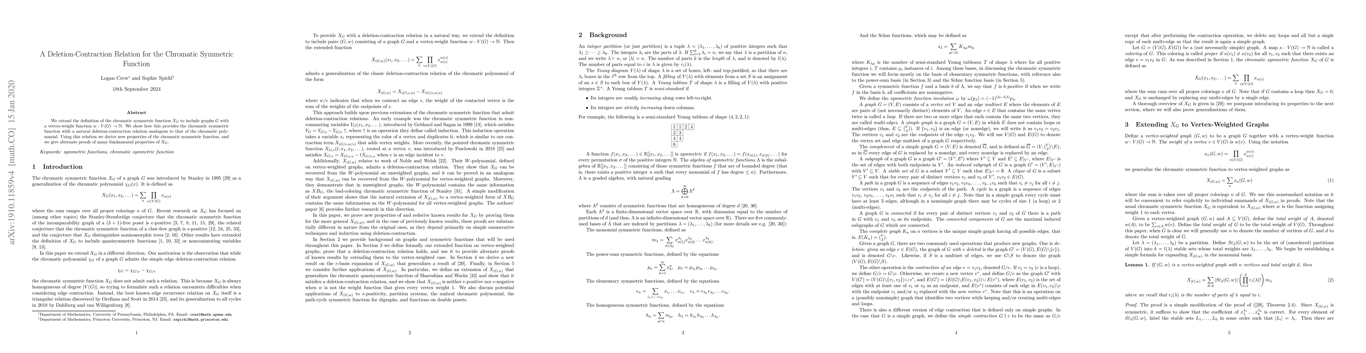 The paper extends the chromatic symmetric function $X_G$ to weighted graphs and introduces a deletion-contraction relation, providing new properties and alternate proofs of fundamental characteristics for $X_G$. This relation parallels that of the chromatic polynomial.