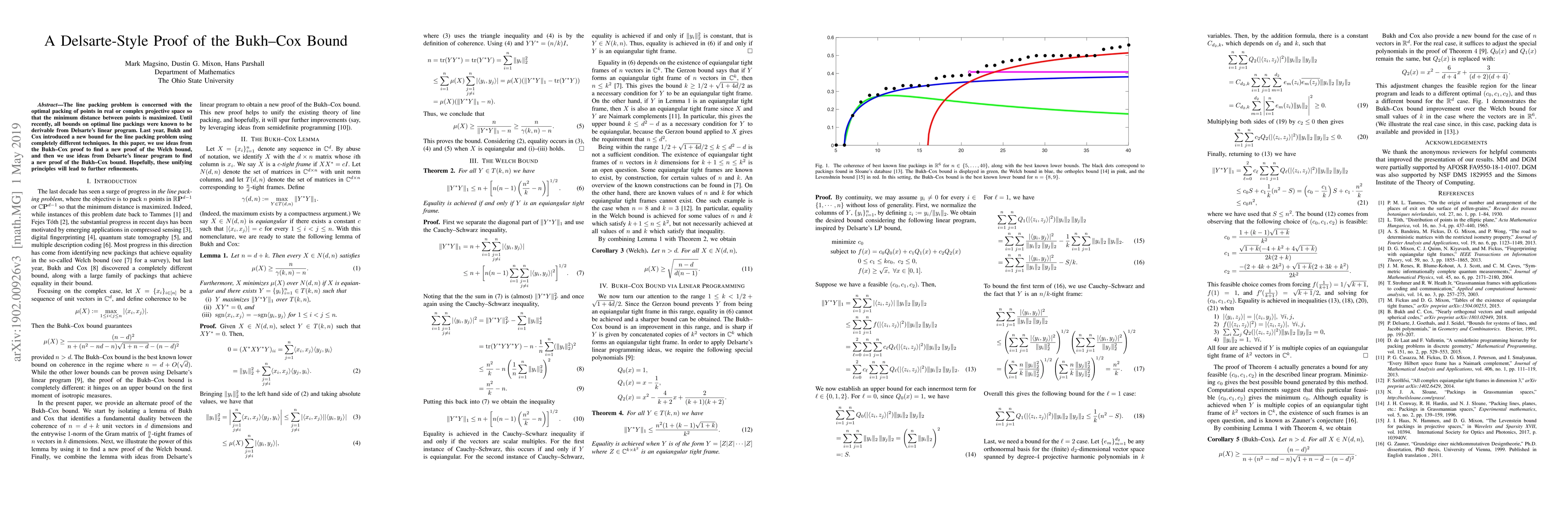 Researchers provide new proofs of two line packing problem bounds using unifying principles from Bukh-Cox and Delsarte's linear program.