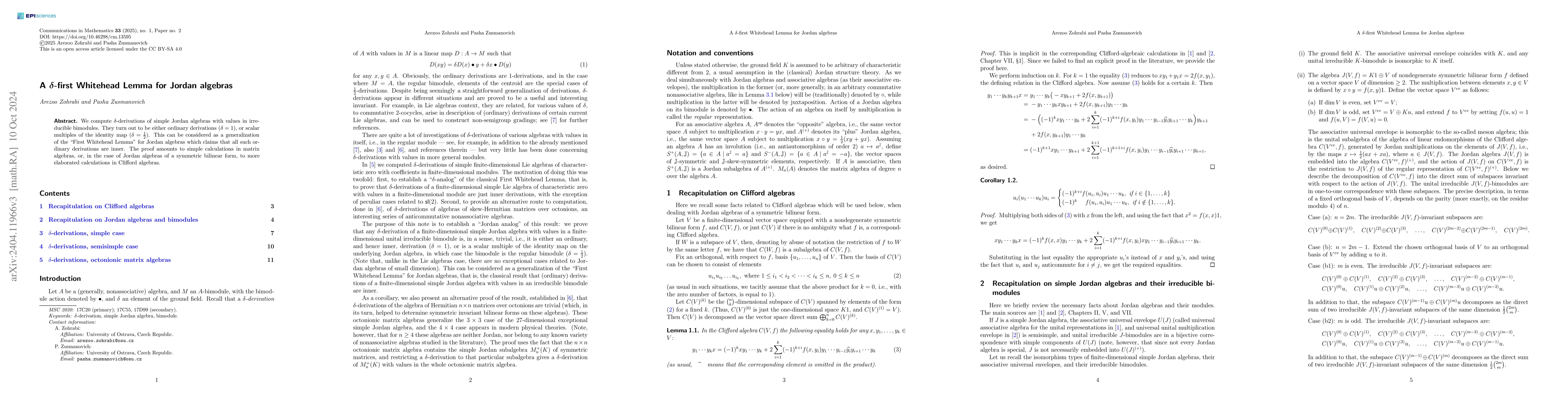 Summary: This paper extends the First Whitehead Lemma for Jordan algebras by identifying $\delta$-derivations as either ordinary derivations or scalar multiples of the identity map, achieved through calculations in matrix or Clifford algebras. This generalizes the original lemma which asserts that all ordinary derivations are inner.