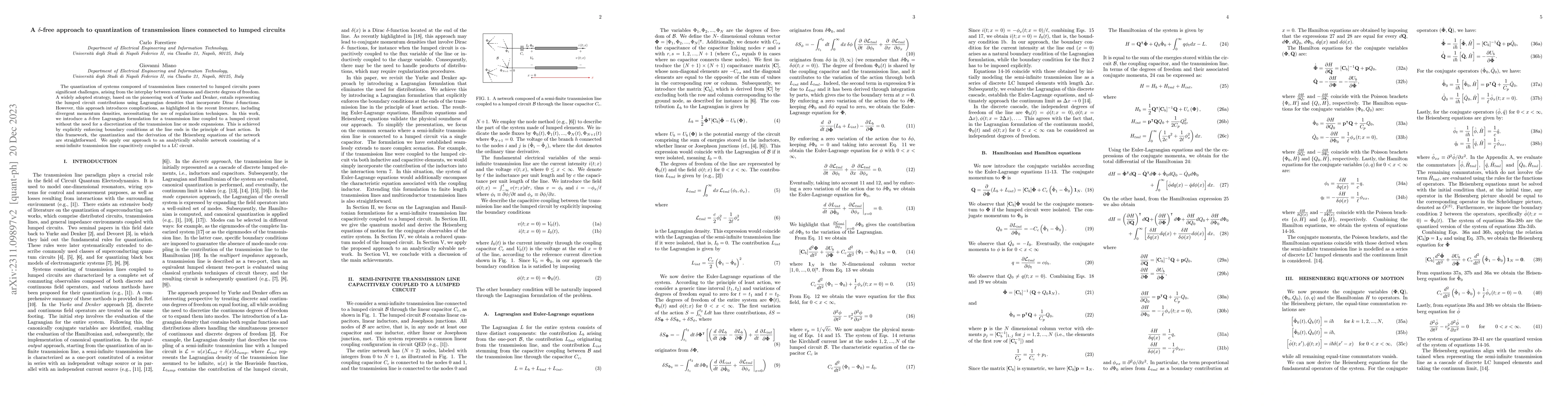 This paper presents a $\delta$-free Lagrangian formulation for quantizing transmission lines connected to lumped circuits, avoiding complications from $\delta$-functions and regularization. The method enforces boundary conditions directly in the principle of least action, simplifying the derivation of Heisenberg equations for the network.