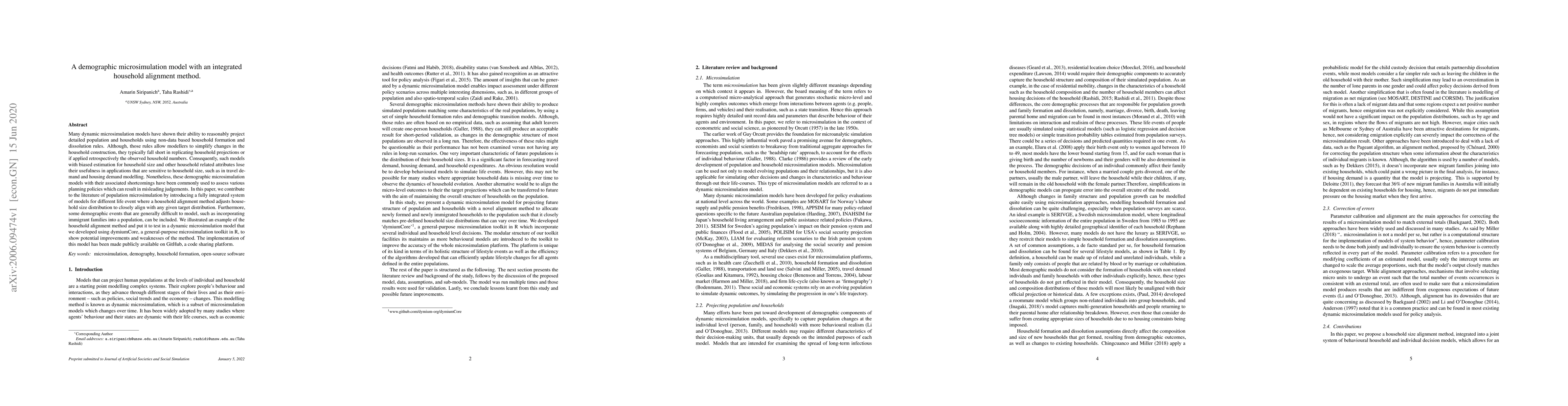 This paper introduces a demographic microsimulation model with an integrated household alignment method to accurately replicate observed household sizes and attributes, addressing the shortcomings of existing models in travel and housing demand applications. The proposed method adjusts household size distributions and includes complex demographic events like immigrant families, demonstrated through a dynamic microsimulation model implemented using dymiumCore in R.