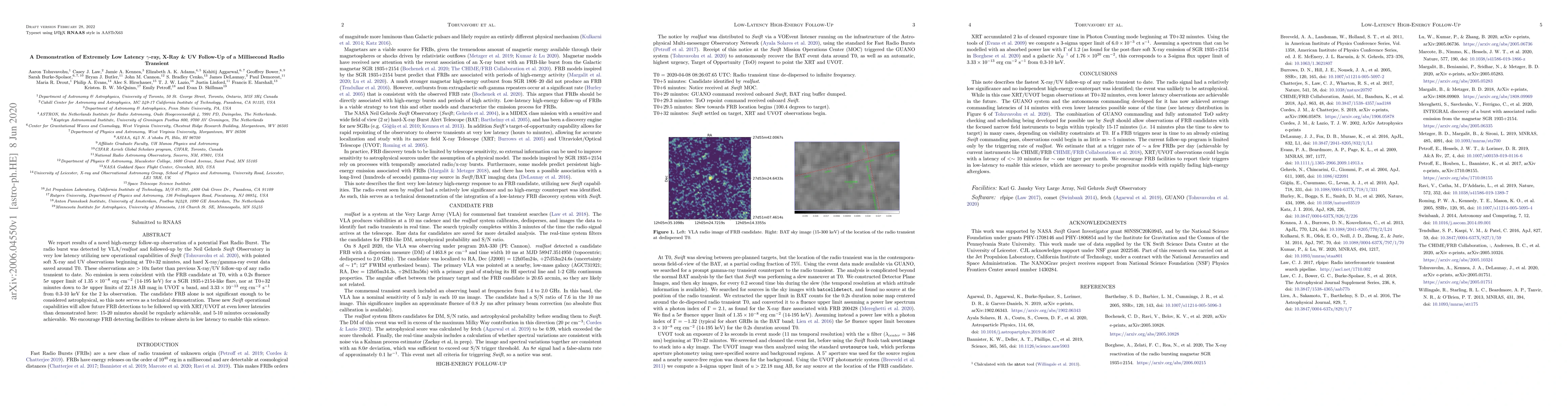 We report results of a novel high-energy follow-up observation of a potential Fast Radio Burst. The radio burst was detected by VLA/realfast and followed-up by the Neil Gehrels Swift Observatory in very low latency utilizing new operational capabilities of Swift (arXiv:2005.01751), with pointed soft X-ray and UV observations beginning at T0+32 minutes, and hard X-ray/gamma-ray event data saved around T0. These observations are $>10$x faster than previous X-ray/UV follow-up of any radio transient to date. No emission is seen coincident with the FRB candidate at T0, with a 0.2s fluence $5\sigma$ upper limit of $1.35\times10^{-8}$ erg cm$^{-2}$ (14-195 keV) for a SGR 1935+2154-like flare, nor at T0+32 minutes down to $3\sigma$ upper limits of 22.18 AB mag in UVOT u band, and $3.33\times10^{-13}$ erg cm$^{-2}$ s$^{-1}$ from 0.3-10 keV for the 2 ks observation. The candidate FRB alone is not significant enough to be considered astrophysical, so this note serves as a technical demonstration. These new Swift operational capabilities will allow future FRB detections to be followed up with Swift at even lower latencies than demonstrated here: 15-20 minutes should be regularly achievable, and 5-10 minutes occasionally achievable. We encourage FRB detecting facilities to release alerts in low latency to enable this science.
