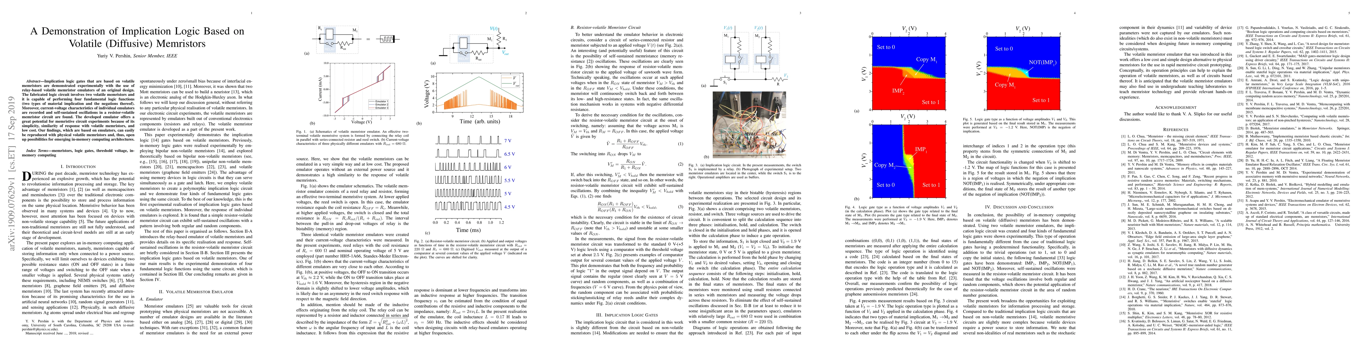 This paper demonstrates implication logic gates using relay-based emulators of volatile memristors, showcasing four fundamental logic operations. The simplicity and low cost of the emulators suggest potential for in-memory computing architectures.