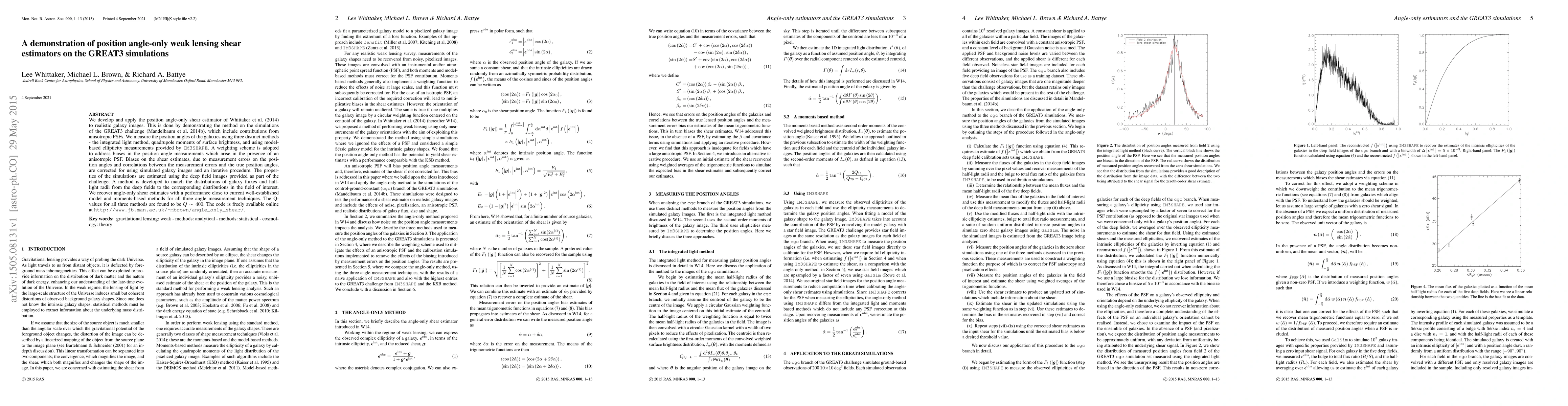 We develop and apply the position angle-only shear estimator of Whittaker et al. (2014) to realistic galaxy images. This is done by demonstrating the method on the simulations of the GREAT3 challenge (Mandelbaum et al. 2014b), which include contributions from anisotropic PSFs. We measure the position angles of the galaxies using three distinct methods - the integrated light method, quadrupole moments of surface brightness, and using model-based ellipticity measurements provided by IM3SHAPE. A weighting scheme is adopted to address biases in the position angle measurements which arise in the presence of an anisotropic PSF. Biases on the shear estimates, due to measurement errors on the position angles and correlations between the measurement errors and the true position angles, are corrected for using simulated galaxy images and an iterative procedure. The properties of the simulations are estimated using the deep field images provided as part of the challenge. A method is developed to match the distributions of galaxy fluxes and half-light radii from the deep fields to the corresponding distributions in the field of interest. We recover angle-only shear estimates with a performance close to current well-established model and moments-based methods for all three angle measurement techniques. The Q-values for all three methods are found to be Q~400. The code is freely available online at http://www.jb.man.ac.uk/~mbrown/angle_only_shear/.