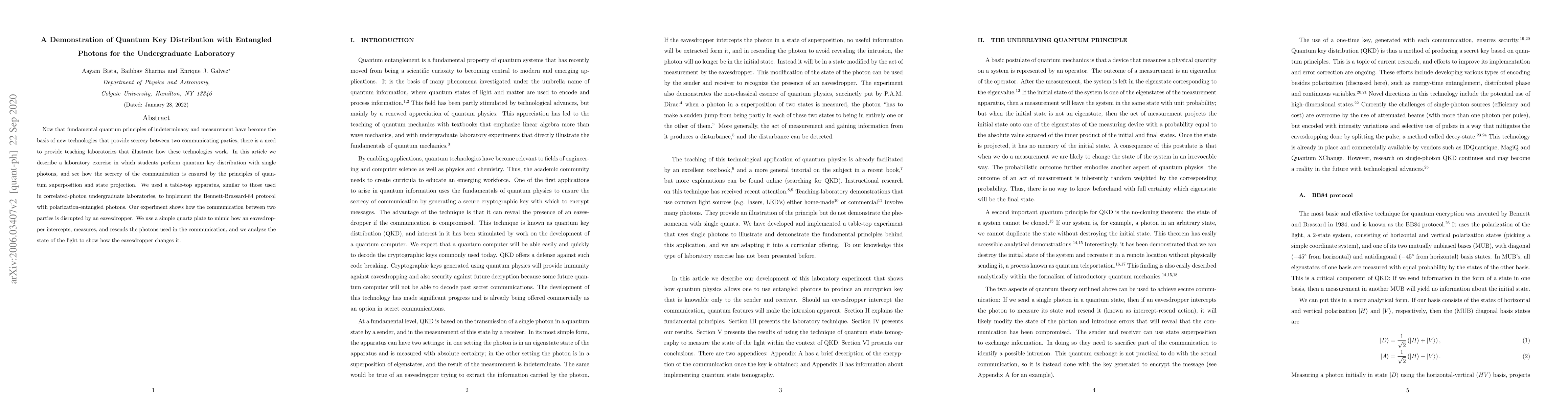 A laboratory exercise demonstrates quantum key distribution with entangled photons, illustrating how secrecy is ensured through principles of quantum superposition and state projection. Students intercept and analyze light to show how eavesdropping disrupts communication.