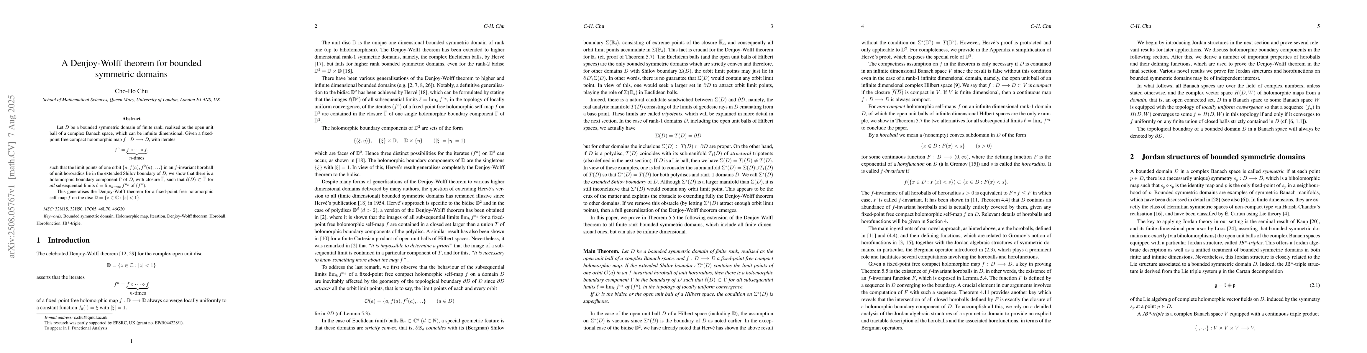 We generalise the Denjoy-Wolff theorem for a fixed-point free holomorphic self-map on the complex unit disc to bounded symmetric domains of finite rank in complex Banach spaces.
