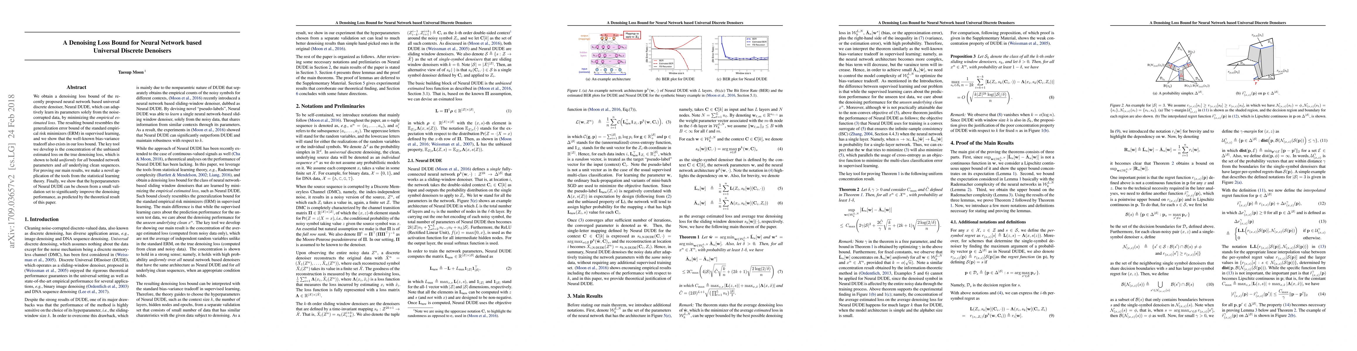 This paper establishes a denoising loss bound for Neural DUDE, a neural network-based denoiser, showing it generalizes well through a bias-variance tradeoff. The key insight is the uniform concentration of the estimated loss, supported by tools from statistical learning theory, which aids in optimizing hyperparameters for improved performance.
