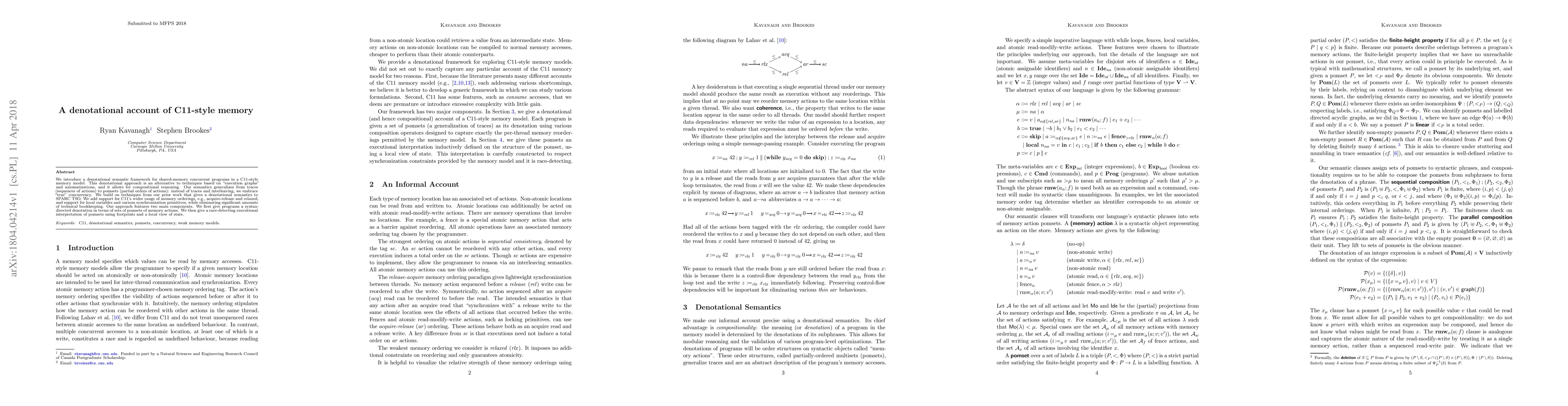 This paper presents a denotational semantic framework for C11-style concurrent memory models, using pomsets for "true" concurrency instead of traces. It generalizes previous work on SPARC TSO, adding support for C11 memory orderings and synchronization primitives, while simplifying technical details.