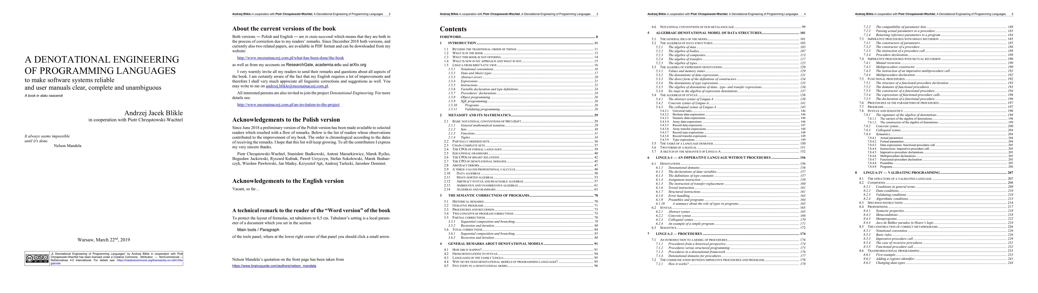 The book is devoted to two research areas: (1) Designing programming languages along with their denotational models. A denotational model of a language consists of two many-sorted algebras - an algebra of syntax and an algebra of denotations - and a (unique) homomorphism from syntax to denotations called the semantics of the language. (2) Designing sound program-constructors for languages with denotational models. In our approach programs syntactically contain their total-correctness specifications. A program is said to be correct if it is correct wrt its specification. A program-constructor is sound if given correct component-programs yields a correct resulting program. Both methods are illustrated on an example-language Lingua.