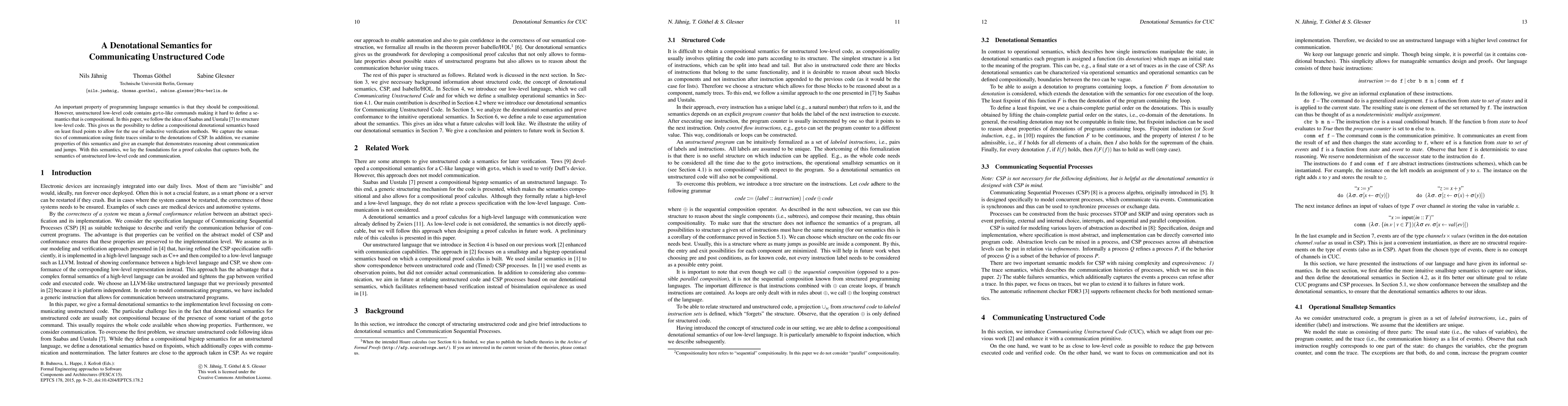 This paper presents a compositional denotational semantics for unstructured low-level code by structuring it using ideas from Saabas and Uustalu, enabling inductive verification. The approach captures communication semantics through finite traces and lays the groundwork for a proof calculus addressing both code semantics and communication.