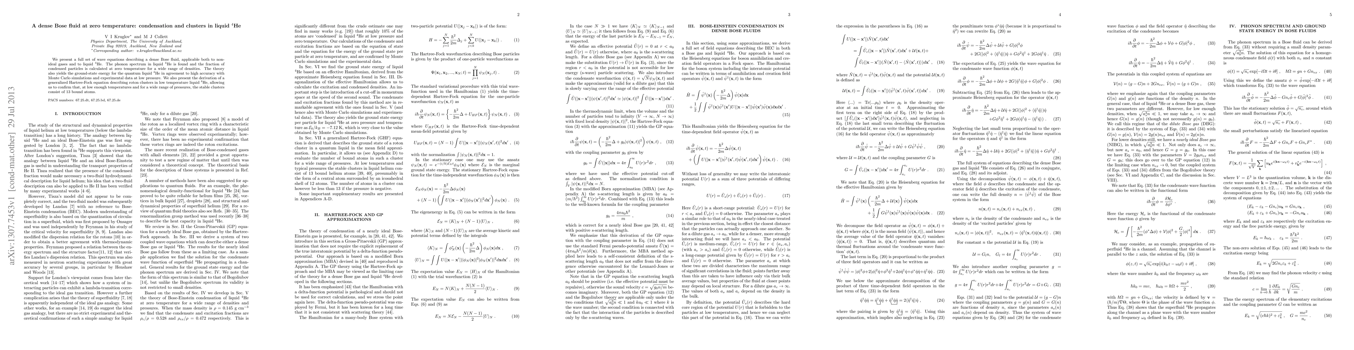 This paper develops wave equations for a dense Bose fluid, specifically liquid 4He, detailing the phonon spectrum and calculating the fraction of condensed particles at zero temperature. It also confirms the existence of stable 13-atom clusters in low-temperature liquid 4He using a generalized Hartree-Fock equation.