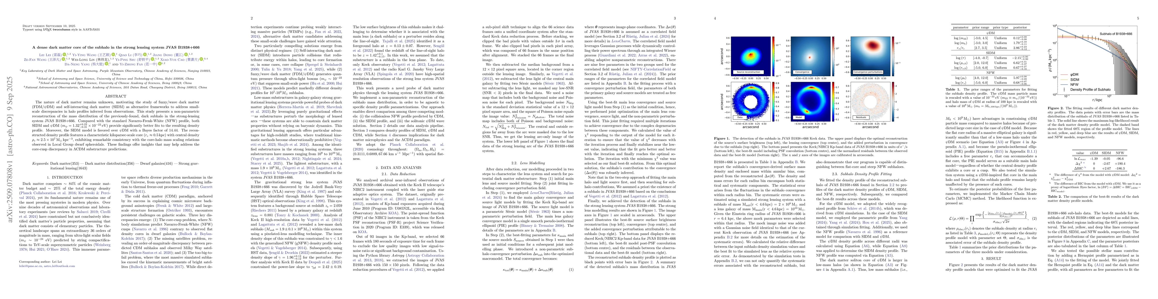 The nature of dark matter remains unknown, motivating the study of fuzzy/wave dark matter (FDM/$\psi$DM) and self-interacting dark matter (SIDM) as alternative frameworks to address small-scale discrepancies in halo profiles inferred from observations. This study presents a non-parametric reconstruction of the mass distribution of the previously-found, dark subhalo in the strong-lensing system JVAS B1938+666. Compared with the standard Navarro-Frenk-White (NFW) profile, both SIDM and $\psi$DM ($m_{\psi}=1.32^{+0.22}_{-0.31}\times 10^{-22} \, \rm eV$) provide significantly better fits to the resulting density profile. Moreover, the SIDM model is favored over $\psi$DM with a Bayes factor of 14.44. The reconstructed density profile features a characteristic kiloparsec-scale core ($r_c \approx 0.5 \, \rm kpc$) with central density $\rho_c \approx 2.5\times 10^{7}\, \rm M_{\odot} \, kpc^{-3} $, exhibiting remarkable consistency with the core-halo mass scaling relations observed in Local Group dwarf spheroidals. These findings offer insights that may help address the core-cusp discrepancy in $\Lambda$CDM substructure predictions.