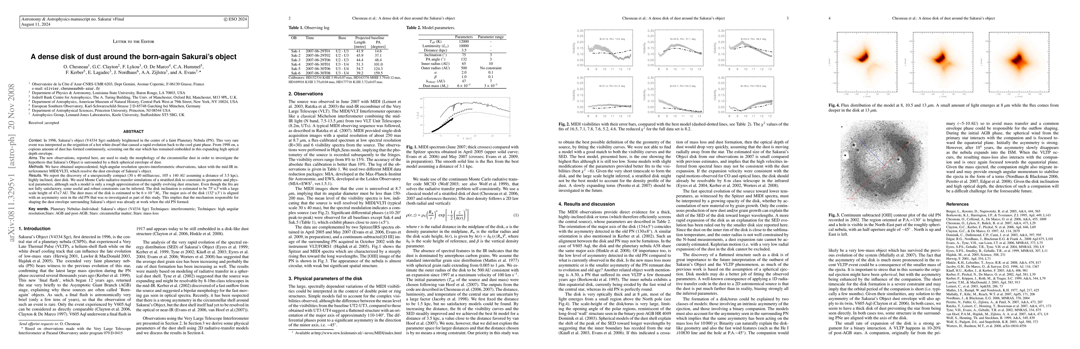 The research reveals a compact, highly inclined dust disk around Sakurai's Object, using high-resolution mid-IR interferometric observations. The disk's inclination is estimated at 75 degrees with a scale height of 47 AU, and its dust mass is about 6 x 10^-5 solar masses. The disk's major axis aligns with an asymmetry in an old Planetary Nebula, suggesting the dust-shaping mechanism was present during the PN's formation.