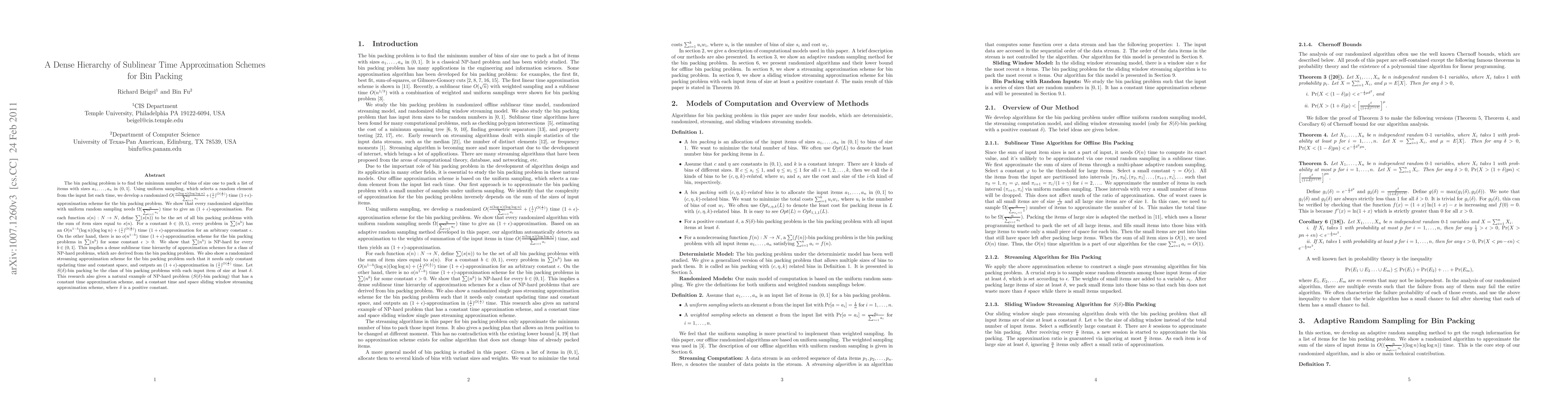 This research develops randomized sublinear time approximation schemes for the bin packing problem using uniform sampling, achieving an efficient $(1+\epsilon)$-approximation. It establishes a dense hierarchy of approximation complexities and proves lower bounds for achieving similar accuracy in specific problem instances.