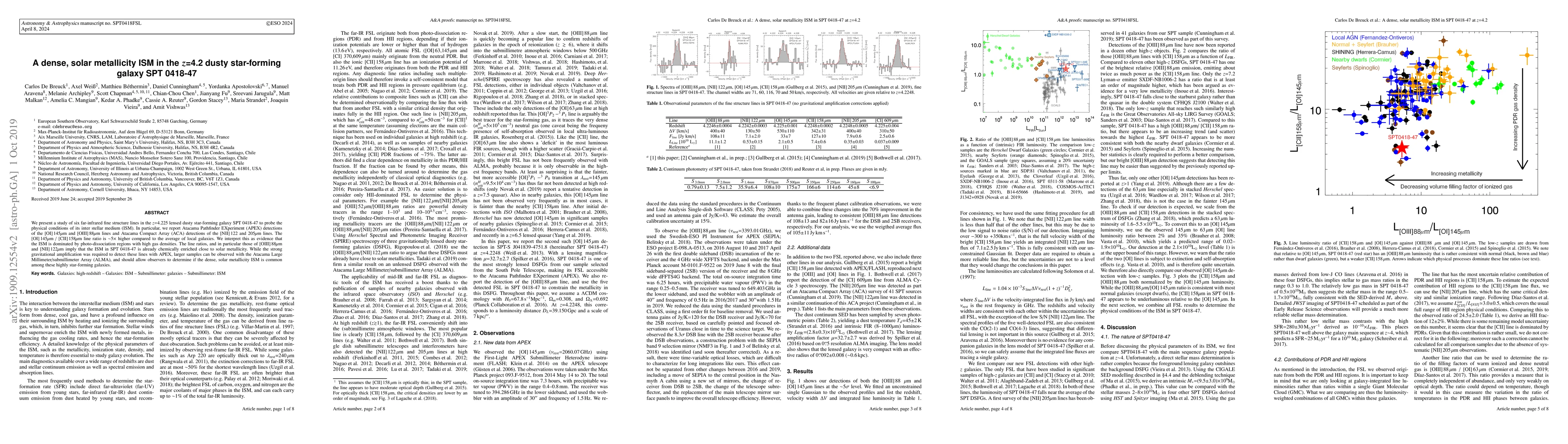 This study uses APEX and ACA observations to analyze six far-infrared lines in the z=4.225 galaxy SPT0418-47, revealing a dense, solar metallicity ISM dominated by high gas densities and photo-dissociation regions. Future observations with ALMA may determine if such conditions are typical in similar star-forming galaxies.