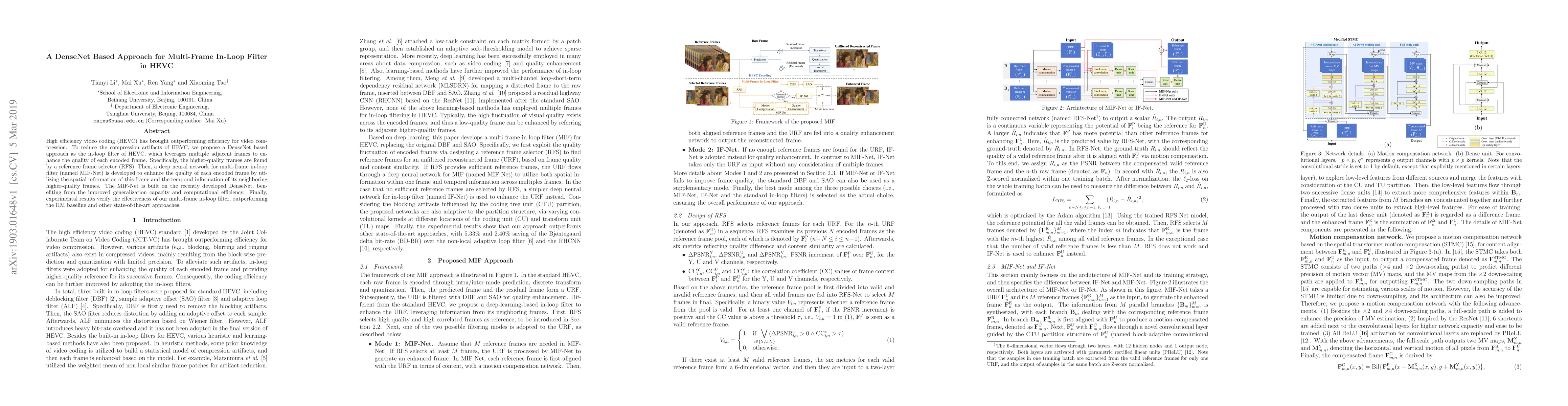 This paper proposes a DenseNet-based approach for the multi-frame in-loop filter in HEVC to reduce compression artifacts. The method uses a reference frame selector and a deep neural network (MIF-Net) to enhance the quality of encoded frames by leveraging spatial and temporal information from multiple frames, achieving superior results compared to the HM baseline and other state-of-the-art techniques.