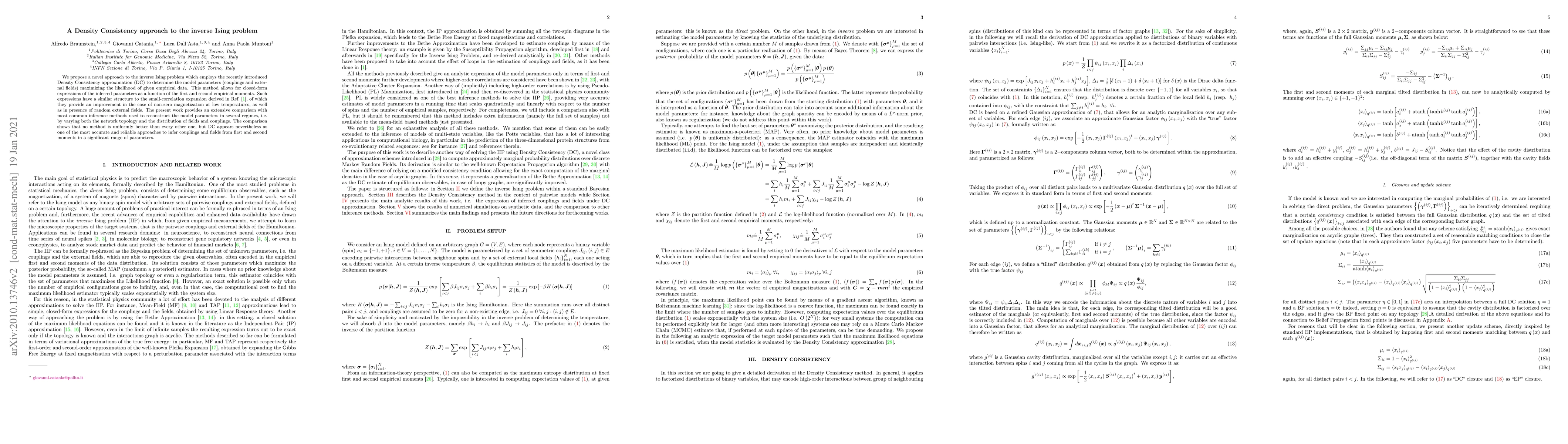 We propose a novel approach to the inverse Ising problem which employs the recently introduced Density Consistency approximation (DC) to determine the model parameters (couplings and external fields) maximizing the likelihood of given empirical data. This method allows for closed-form expressions of the inferred parameters as a function of the first and second empirical moments. Such expressions have a similar structure to the small-correlation expansion derived by Sessak and Monasson, of which they provide an improvement in the case of non-zero magnetization at low temperatures, as well as in presence of random external fields. The present work provides an extensive comparison with most common inference methods used to reconstruct the model parameters in several regimes, i.e. by varying both the network topology and the distribution of fields and couplings. The comparison shows that no method is uniformly better than every other one, but DC appears nevertheless as one of the most accurate and reliable approaches to infer couplings and fields from first and second moments in a significant range of parameters.
