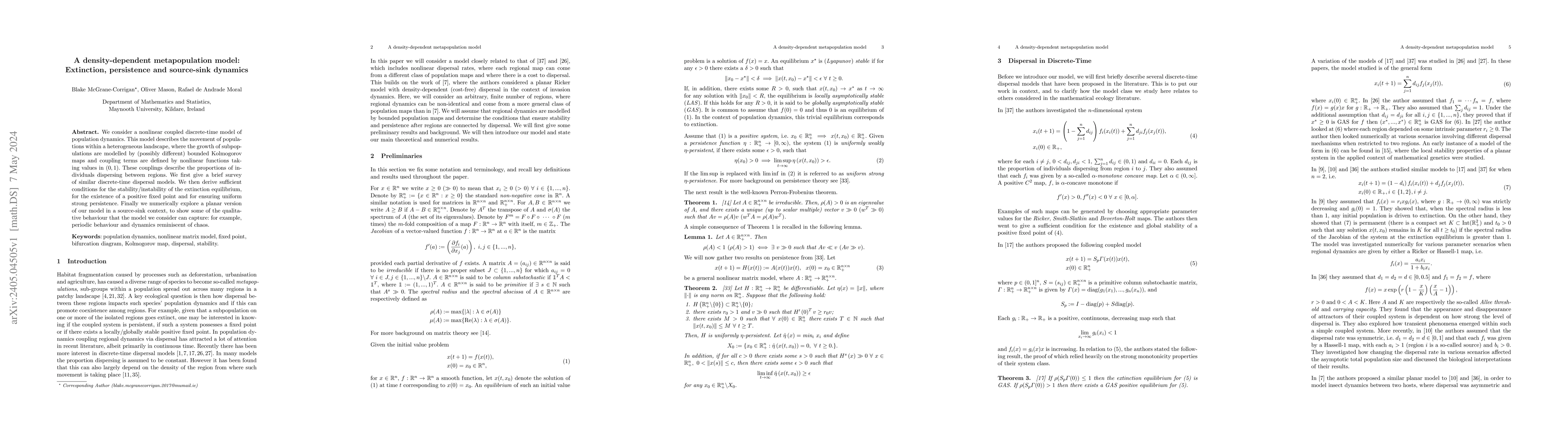 This paper develops a density-dependent metapopulation model with discrete-time dynamics, exploring extinction, persistence, and source-sink dynamics in a heterogeneous landscape. It provides analytical conditions for stability and persistence and numerically investigates the model’s chaotic and periodic behaviors in a source-sink framework.