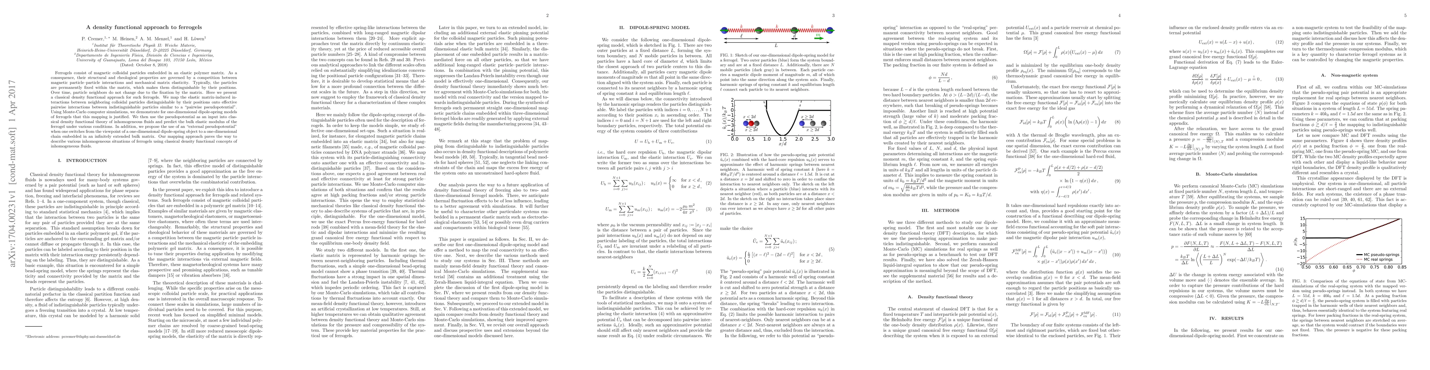 Ferrogels consist of magnetic colloidal particles embedded in an elastic polymer matrix. As a consequence, their structural and rheological properties are governed by a competition between magnetic particle-particle interactions and mechanical matrix elasticity. Typically, the particles are permanently fixed within the matrix, which makes them distinguishable by their positions. Over time, particle neighbors do not change due to the fixation by the matrix. Here we present a classical density functional approach for such ferrogels. We map the elastic matrix-induced interactions between neighboring colloidal particles distinguishable by their positions onto effective pairwise interactions between indistinguishable particles similar to a "pairwise pseudopotential". Using Monte-Carlo computer simulations, we demonstrate for one-dimensional dipole-spring models of ferrogels that this mapping is justified. We then use the pseudopotential as an input into classical density functional theory of inhomogeneous fluids and predict the bulk elastic modulus of the ferrogel under various conditions. In addition, we propose the use of an "external pseudopotential" when one switches from the viewpoint of a one-dimensional dipole-spring object to a one-dimensional chain embedded in an infinitely extended bulk matrix. Our mapping approach paves the way to describe various inhomogeneous situations of ferrogels using classical density functional concepts of inhomogeneous fluids.