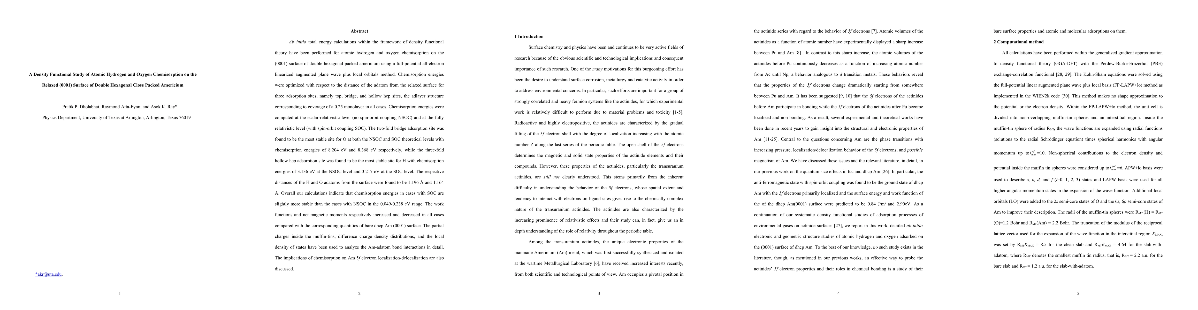 This study uses density functional theory to investigate atomic hydrogen and oxygen chemisorption on the relaxed (0001) surface of double hexagonal close packed americium. The two-fold bridge site is found to be the most stable for oxygen, while the three-fold hollow hcp site is optimal for hydrogen, with chemisorption energies slightly higher when considering spin-orbit coupling.