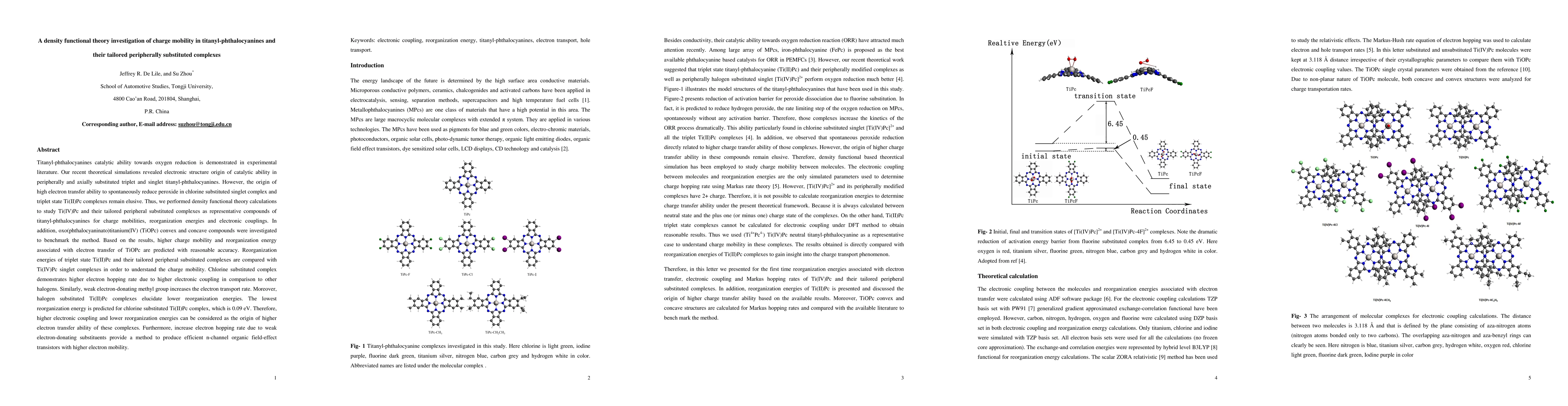 Titanyl-phthalocyanines catalytic ability towards oxygen reduction is demonstrated in experimental literature. Our recent theoretical simulations revealed electronic structure origin of catalytic ability in peripherally and axially substituted triplet and singlet titanyl-phthalocyanines. However, the origin of high electron transfer ability to spontaneously reduce peroxide in chlorine substituted singlet complex and triplet state Ti(II)Pc complexes remain elusive. Thus, we performed density functional theory calculations to study Ti(IV)Pc and their tailored peripheral substituted complexes as representative compounds of titanyl-phthalocyanines for charge mobilities, reorganization energies and electronic couplings. In addition, oxo(phthalocyaninato)titanium(IV) (TiOPc) convex and concave compounds were investigated to benchmark the method. Based on the results, Reorganization energies of triplet state Ti(II)Pc and their tailored peripheral substituted complexes are compared with Ti(IV)Pc singlet complexes in order to understand the charge mobility. Chlorine substituted complex demonstrates higher electron hopping rate due to higher electronic coupling in comparison to other halogens. Similarly, weak electron-donating methyl group increases the electron transport rate. Moreover, halogen substituted Ti(II)Pc complexes elucidate lower reorganization energies. The lowest reorganization energy is predicted for chlorine substituted Ti(II)Pc complex, which is 0.09 eV. Therefore, higher electronic coupling and lower reorganization energies can be considered as the origin of higher electron transfer ability of these complexes. Furthermore, increase electron hopping rate due to weak electron-donating substituents provide a method to produce efficient n-channel organic field-effect transistors with higher electron mobility.
