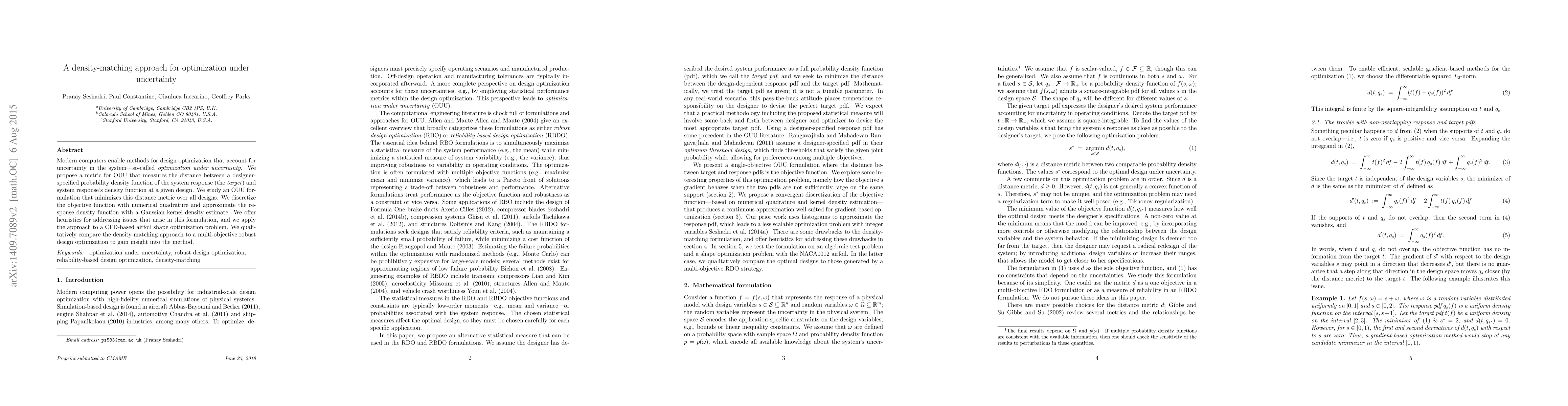 Modern computers enable methods for design optimization that account for uncertainty in the system---so-called optimization under uncertainty. We propose a metric for OUU that measures the distance between a designer-specified probability density function of the system response the target and system response's density function at a given design. We study an OUU formulation that minimizes this distance metric over all designs. We discretize the objective function with numerical quadrature and approximate the response density function with a Gaussian kernel density estimate. We offer heuristics for addressing issues that arise in this formulation, and we apply the approach to a CFD-based airfoil shape optimization problem. We qualitatively compare the density-matching approach to a multi-objective robust design optimization to gain insight into the method.