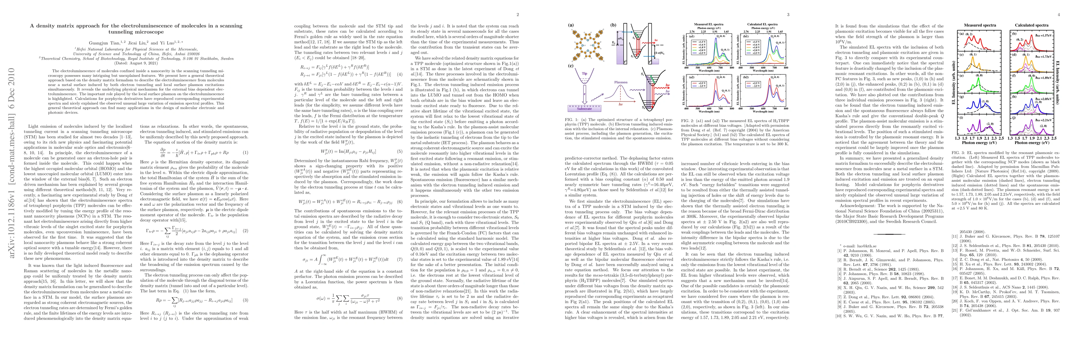 This paper introduces a density matrix formalism to explain the electroluminescence of molecules in a scanning tunneling microscope, emphasizing the role of local surface plasmons. The theoretical model successfully reproduces experimental spectra of porphyrin derivatives and can aid in designing molecular electronic and photonic devices.