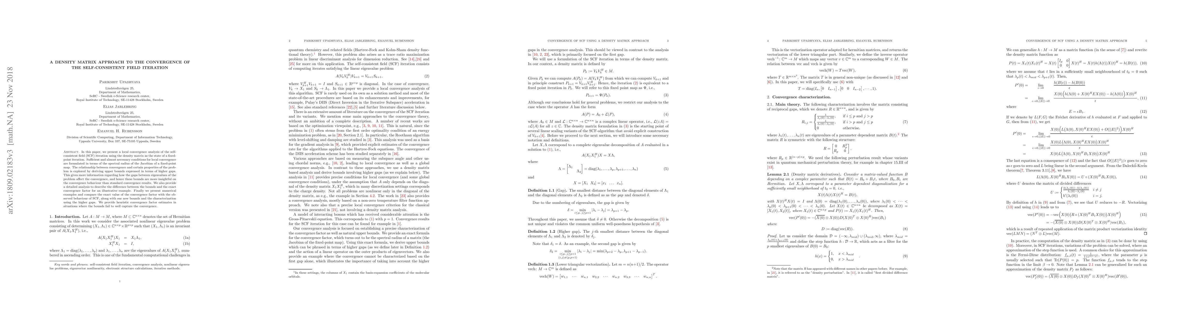 This paper analyzes the local convergence of the self-consistent field (SCF) iteration using the density matrix, establishing conditions based on the spectral radius of the Jacobian. It provides insightful upper bounds on convergence influenced by eigenvalue gaps, comparing these bounds with exact convergence factors and numerical examples.