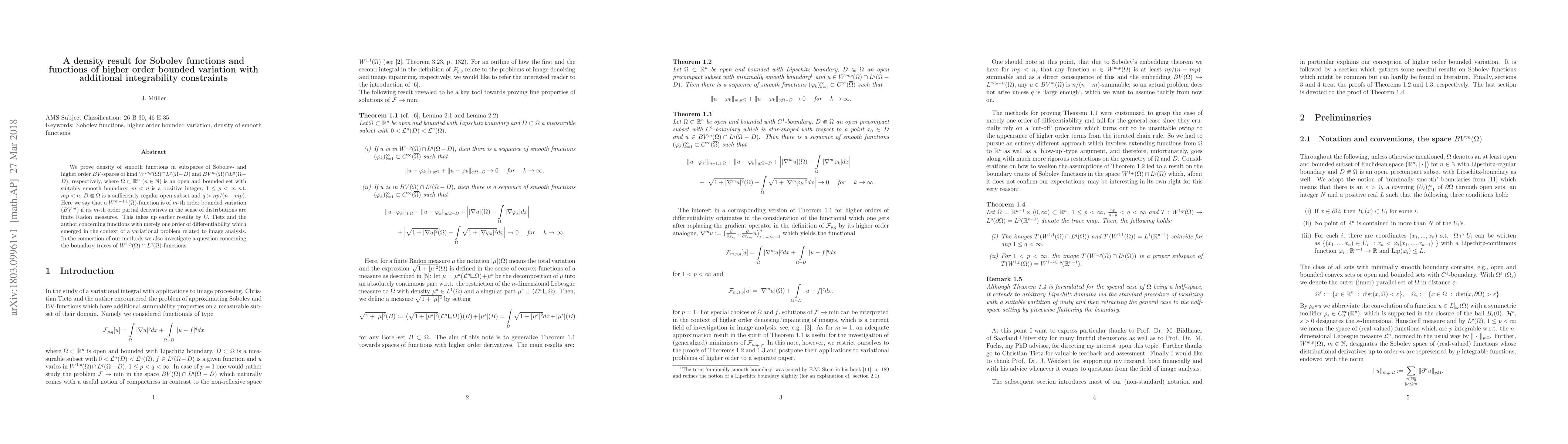 This research establishes that smooth functions densely populate specific subspaces within Sobolev and higher-order bounded variation function spaces, given certain conditions on p, q, and the regularity of the domain. The findings extend previous work on functions with one order of differentiability, relevant to image analysis variational problems. The proof also addresses boundary traces of functions in weighted Sobolev spaces.