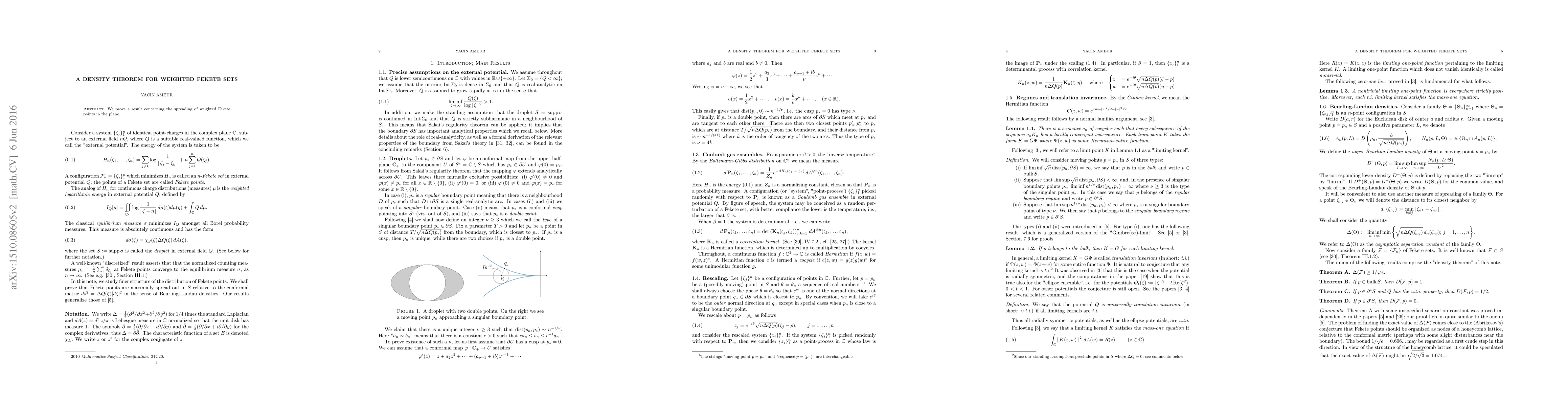 Summary: This paper establishes a density theorem for the distribution of weighted Fekete sets in the plane, providing insights into the spreading behavior of these points. The findings contribute to the understanding of geometric configurations in analytic number theory.