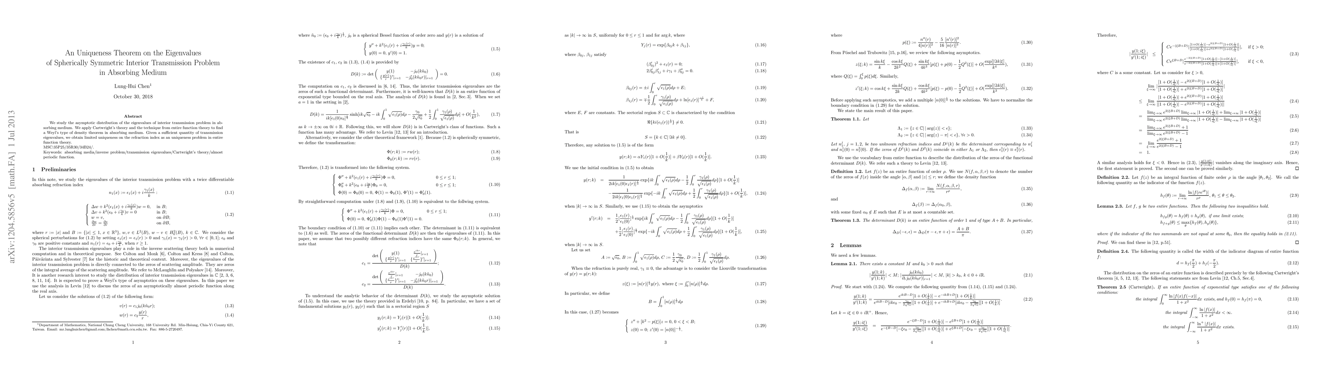 This paper presents a Weyl's type density theorem for the eigenvalues of a spherically symmetric interior transmission problem in an absorbing medium, utilizing Cartwright's theory and asymptotic periodic entire function techniques to describe the asymptotic distribution of these eigenvalues.
