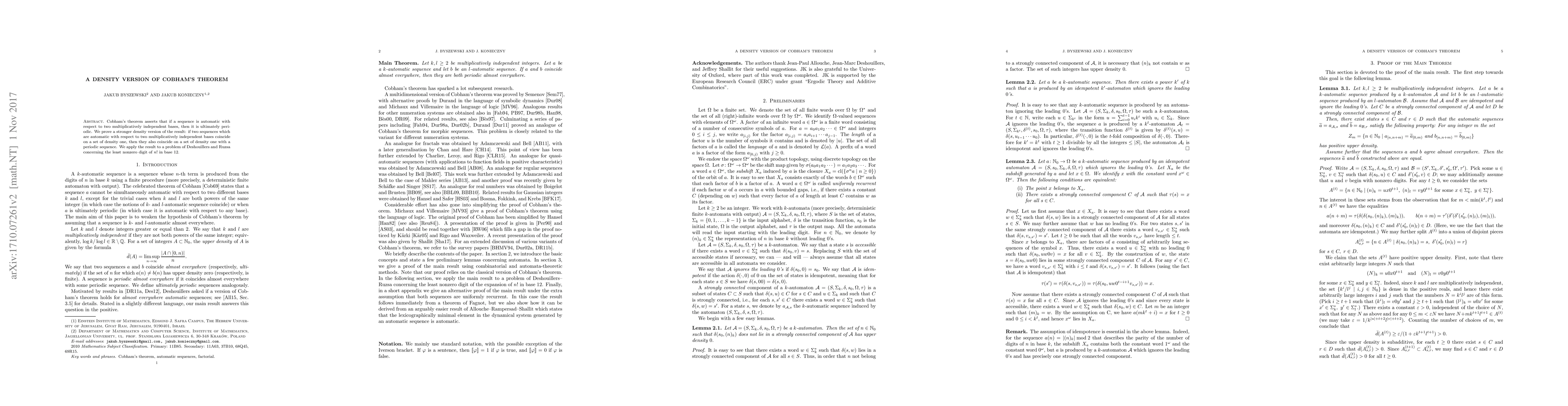 Summary: This paper proves a density version of Cobham's theorem, showing that if two automatic sequences coincide on a set of density one, they also coincide on a set of density one with a periodic sequence. The result is applied to resolve a problem regarding the least nonzero digit of $n!$ in base $12$.