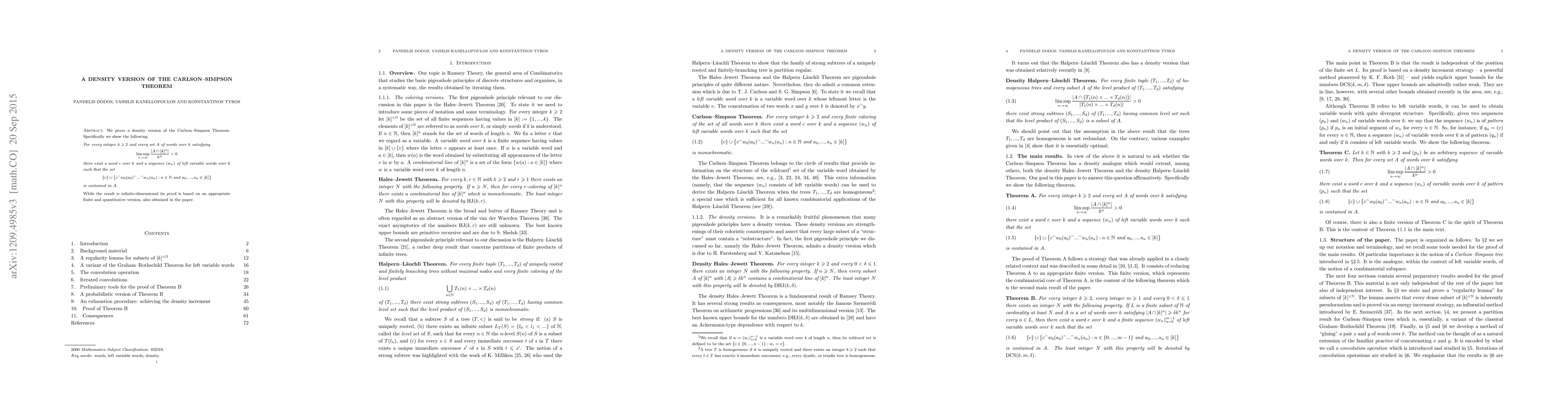This paper proves a density version of the Carlson-Simpson Theorem, showing that for any set of words over a finite set with positive upper limit density, there exists a word and a sequence of left variable words such that a specific constructed set is contained within the original set. The proof leverages a finite and quantitative version of the theorem.