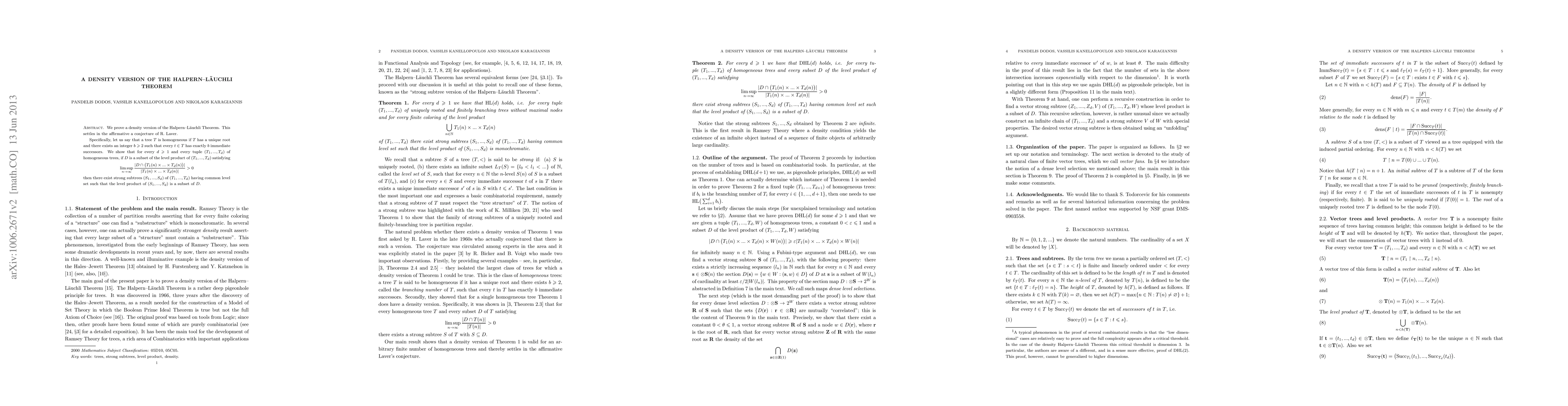 We prove a density version of the Halpern-L\"{a}uchli Theorem. This settles in the affirmative a conjecture of R. Laver. Specifically, let us say that a tree $T$ is homogeneous if $T$ has a unique root and there exists an integer $b\meg 2$ such that every $t\in T$ has exactly $b$ immediate successors. We show that for every $d\meg 1$ and every tuple $(T_1,...,T_d)$ of homogeneous trees, if $D$ is a subset of the level product of $(T_1,...,T_d)$ satisfying \[ \limsup_{n\to\infty} \frac{|D\cap \big(T_1(n)\times ... \times T_d(n)\big)|}{|T_1(n)\times ... \times T_d(n)|}>0\] then there exist strong subtrees $(S_1, ..., S_d)$ of $(T_1,...,T_d)$ having common level set such that the level product of $(S_1,...,S_d)$ is a subset of $D$.