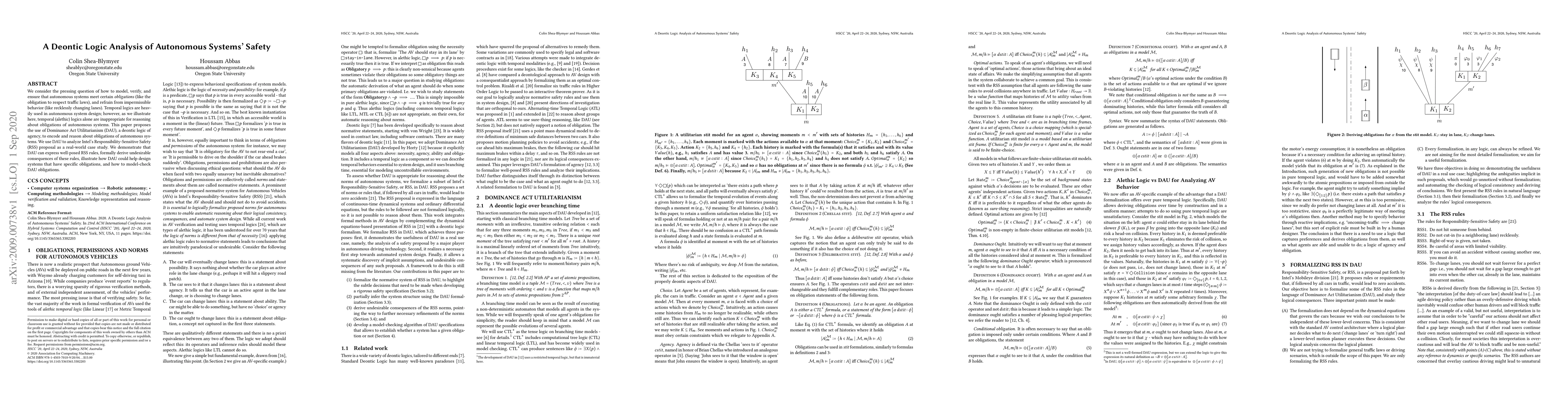 We consider the pressing question of how to model, verify, and ensure that autonomous systems meet certain \textit{obligations} (like the obligation to respect traffic laws), and refrain from impermissible behavior (like recklessly changing lanes). Temporal logics are heavily used in autonomous system design; however, as we illustrate here, temporal (alethic) logics alone are inappropriate for reasoning about obligations of autonomous systems. This paper proposes the use of Dominance Act Utilitarianism (DAU), a deontic logic of agency, to encode and reason about obligations of autonomous systems. We use DAU to analyze Intel's Responsibility-Sensitive Safety (RSS) proposal as a real-world case study. We demonstrate that DAU can express well-posed RSS rules, formally derive undesirable consequences of these rules, illustrate how DAU could help design systems that have specific obligations, and how to model-check DAU obligations.
