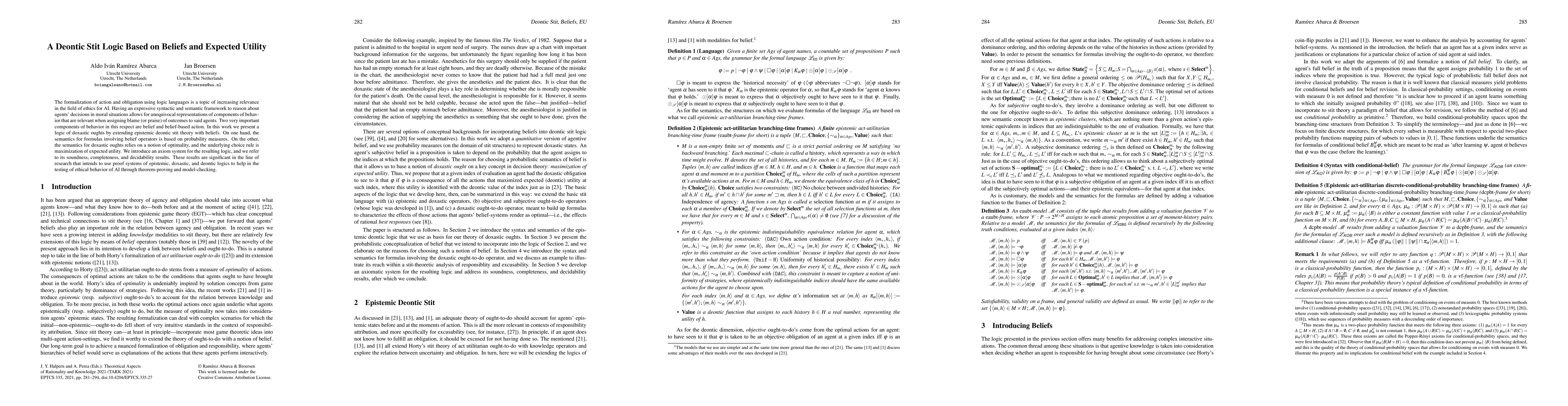 This paper develops a deontic stit logic that incorporates beliefs and expected utility to formalize agents' decisions and moral obligations in AI ethics. The logic's semantics are grounded in probability and optimality, aiming to provide clear frameworks for assigning moral responsibility in AI actions.
