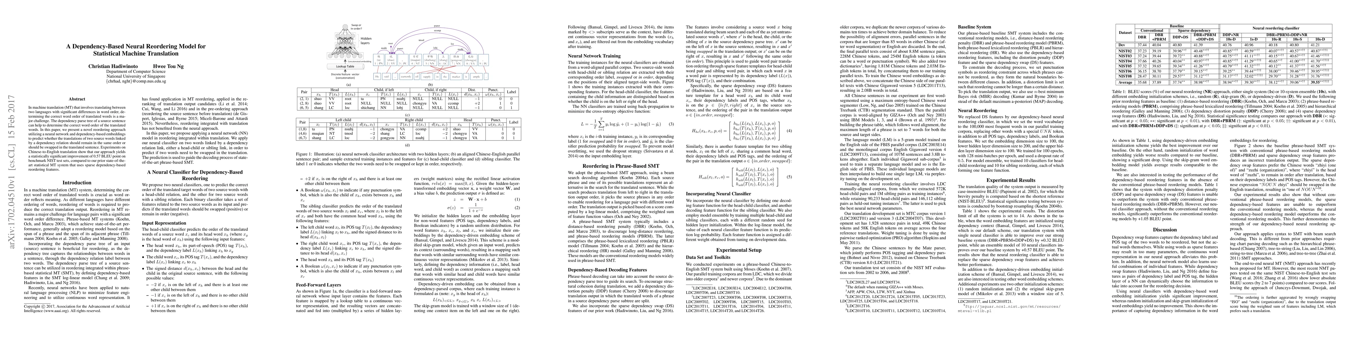 This paper proposes a neural reordering model that uses dependency-based embeddings to determine the correct order of translated words in machine translation, achieving a 0.57 BLEU point improvement over previous methods on Chinese-to-English translation tasks.