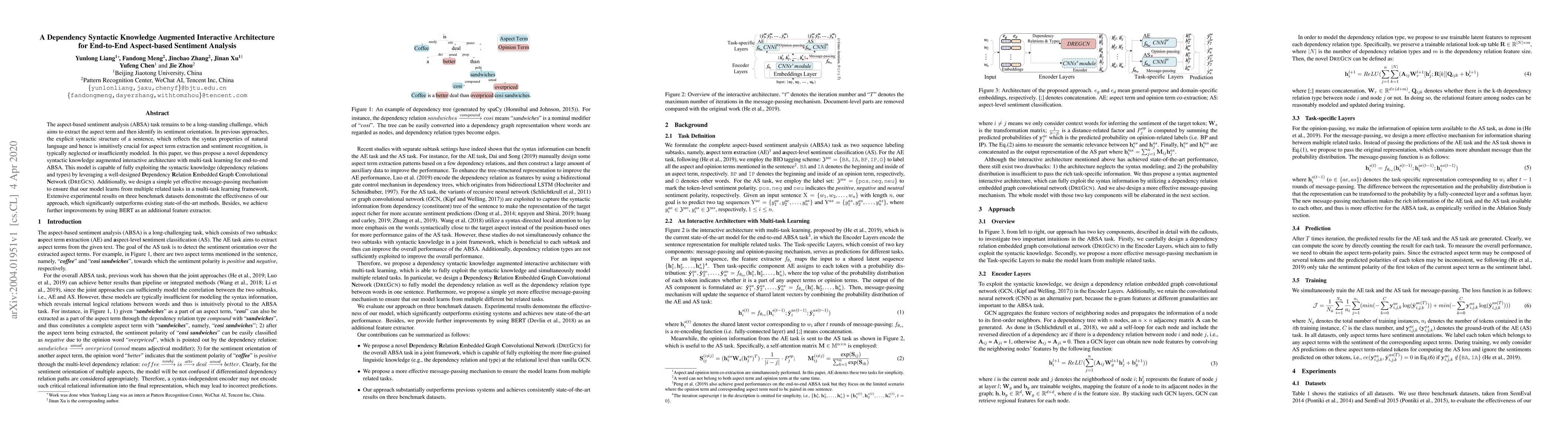 This paper proposes a novel interactive architecture for aspect-based sentiment analysis that incorporates dependency syntactic knowledge through a Dependency Relation Embedded Graph Convolutional Network (DreGcn). The model also employs multi-task learning and message-passing mechanisms to outperform existing methods on benchmark datasets.