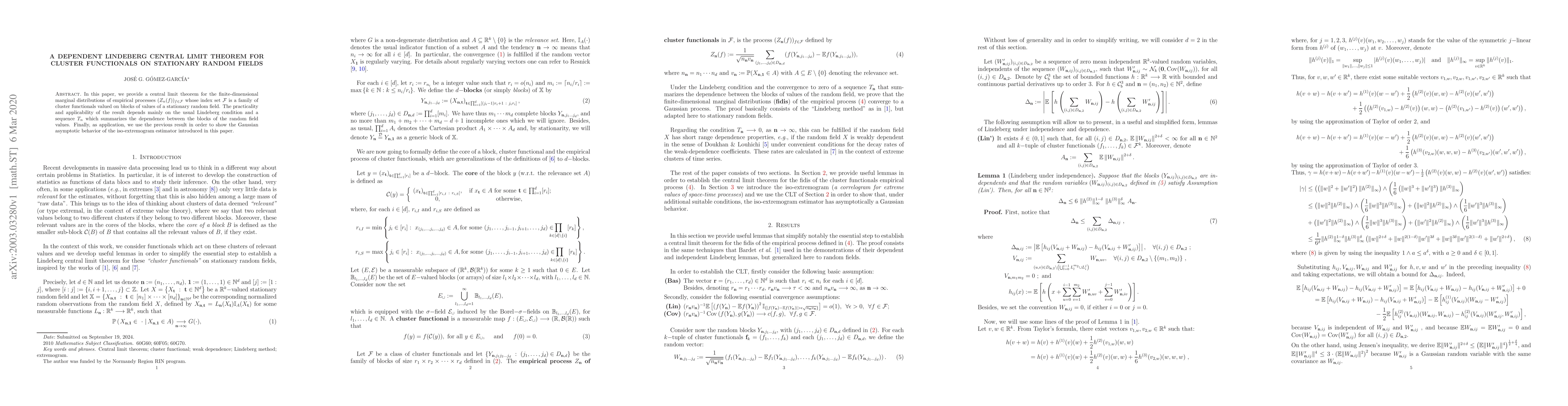 This paper establishes a dependent Lindeberg central limit theorem for empirical processes indexed by cluster functionals on stationary random fields, relying on the Lindeberg condition and a sequence summarizing block dependence. An application demonstrates the Gaussian asymptotic behavior of a newly introduced iso-extremogram estimator.