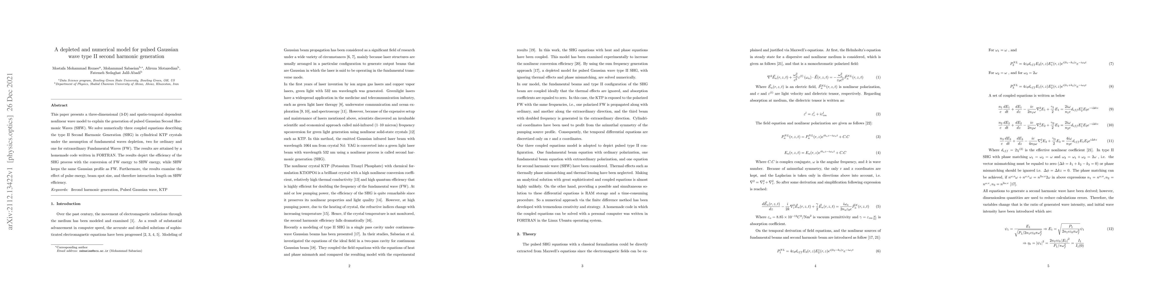 This paper presents a three-dimensional (3-D) and spatio-temporal dependent nonlinear wave model to explain the generation of pulsed Gaussian Second Harmonic Waves (SHW). We solve numerically three coupled equations describing the type II Second Harmonic Generation (SHG) in cylindrical KTP crystals under the assumption of fundamental waves depletion, two for ordinary and one for extraordinary Fundamental Waves (FW). The results are attained by a homemade code written in FORTRAN. The results depict the efficiency of the SHG process with the conversion of FW energy to SHW energy, while SHW keeps the same Gaussian profile as FW. Furthermore, the results examine the effect of pulse energy, beam spot size, and therefore interaction length on SHW efficiency.