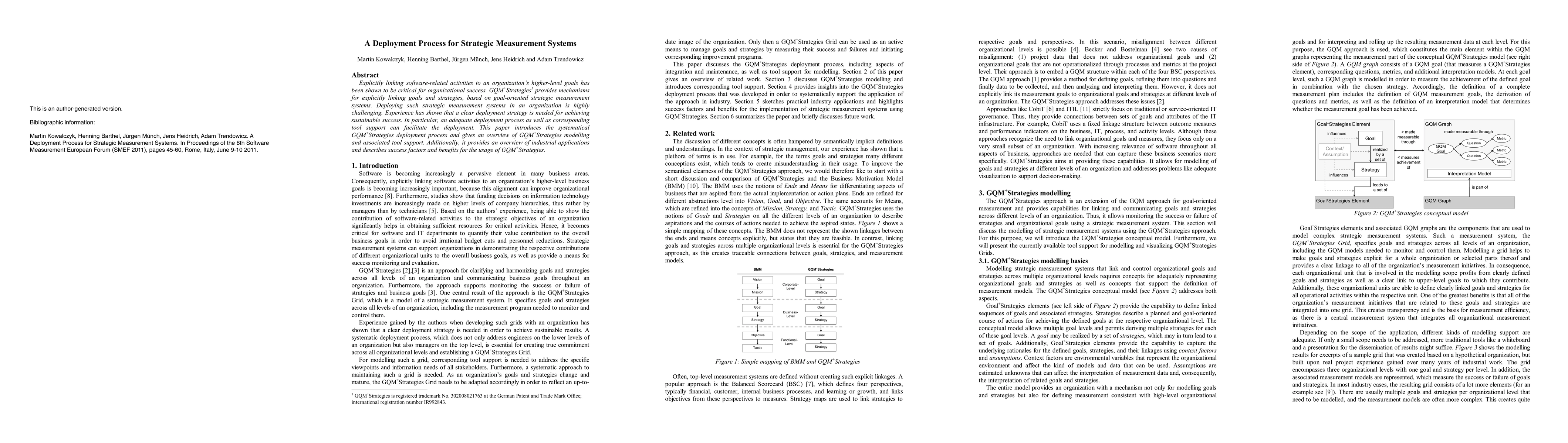 This paper presents a systematic deployment process for GQM+Strategies, a goal-oriented strategic measurement system, to link software activities with organizational goals. It outlines the process, modelling techniques, and tool support, and discusses industrial applications, success factors, and benefits.