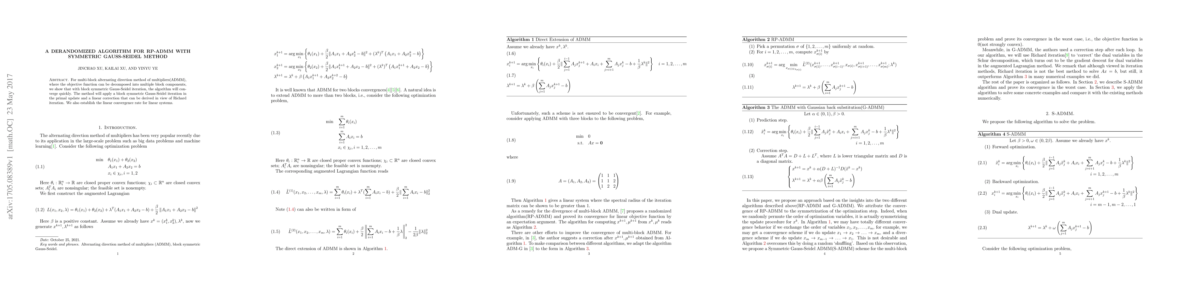 This paper presents a derandomized algorithm for the RP-ADMM method using a block symmetric Gauss-Seidel iteration, which ensures rapid convergence. It also establishes a linear convergence rate for linear systems and applies a linear correction derived from Richard iteration.