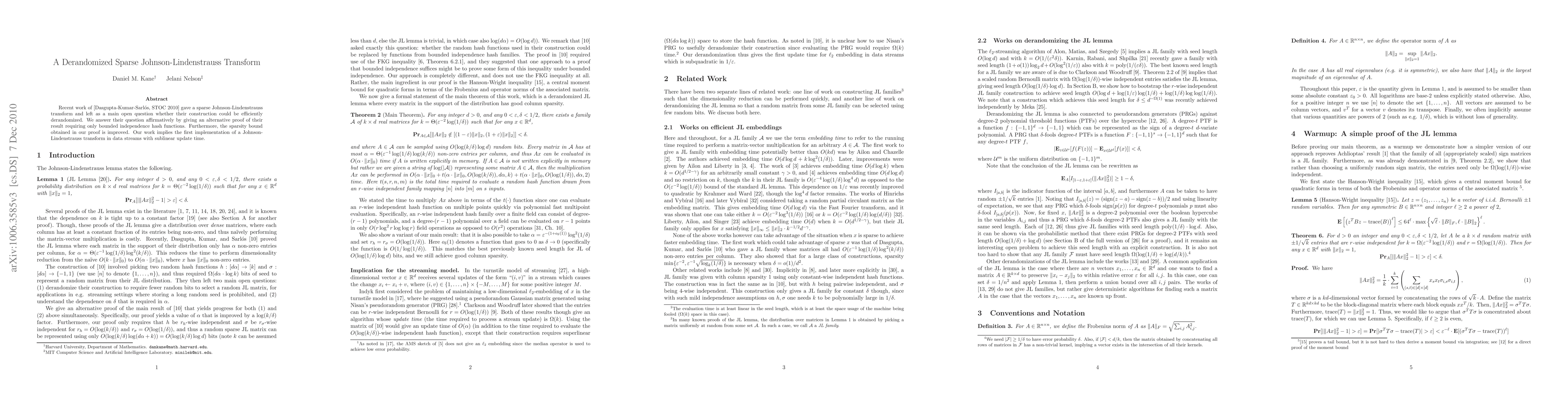This paper presents a derandomized version of the sparse Johnson-Lindenstrauss transform, achieving the same results using only bounded independence hash functions instead of random sampling. The improved sparsity bound is achieved through a novel spectral moment bound for quadratic forms.